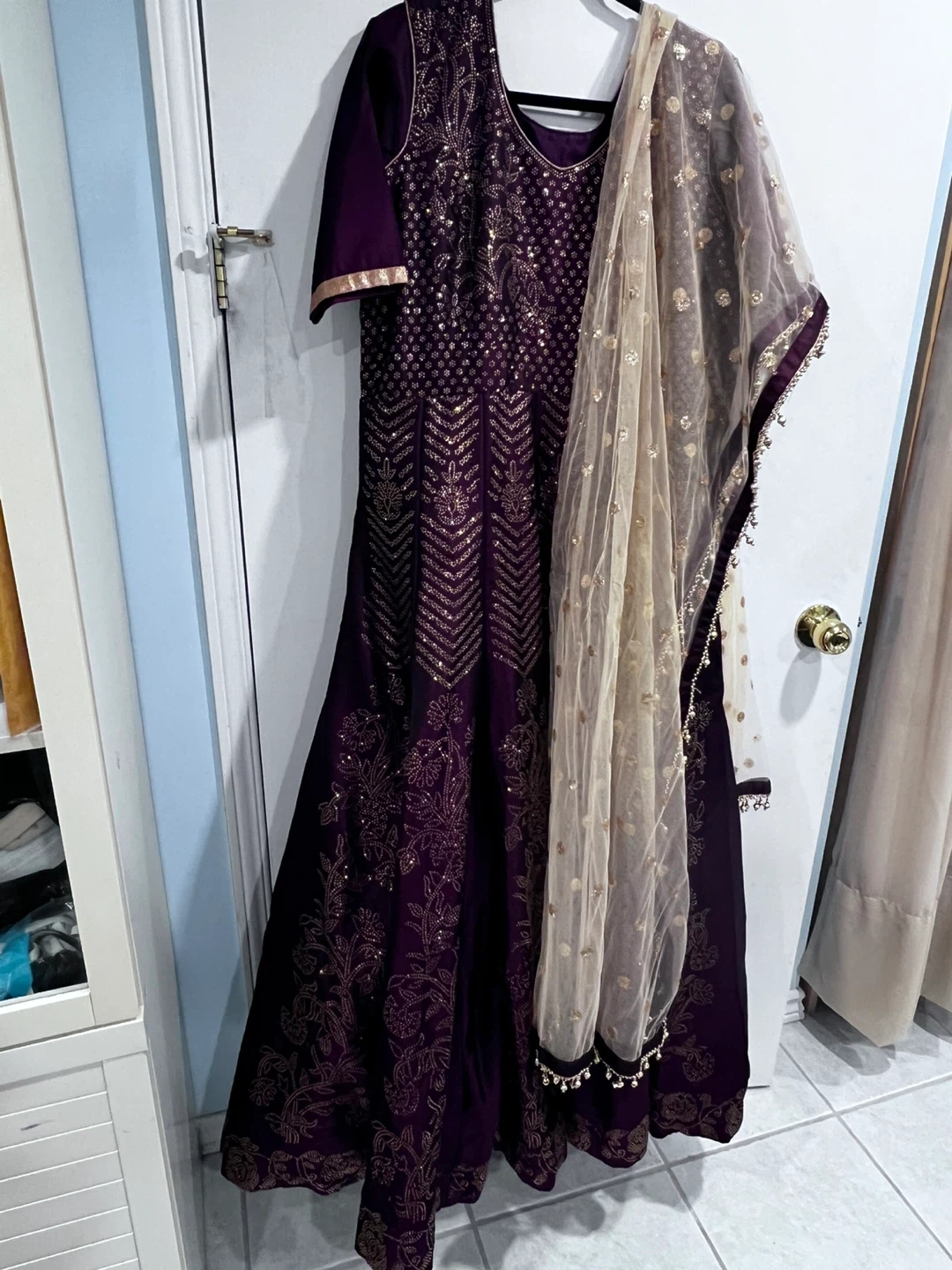 Beautiful burgundy Anarkali suit with gold embroidery and a matching dupatta. It's in great condition and perfect for a special occasion!