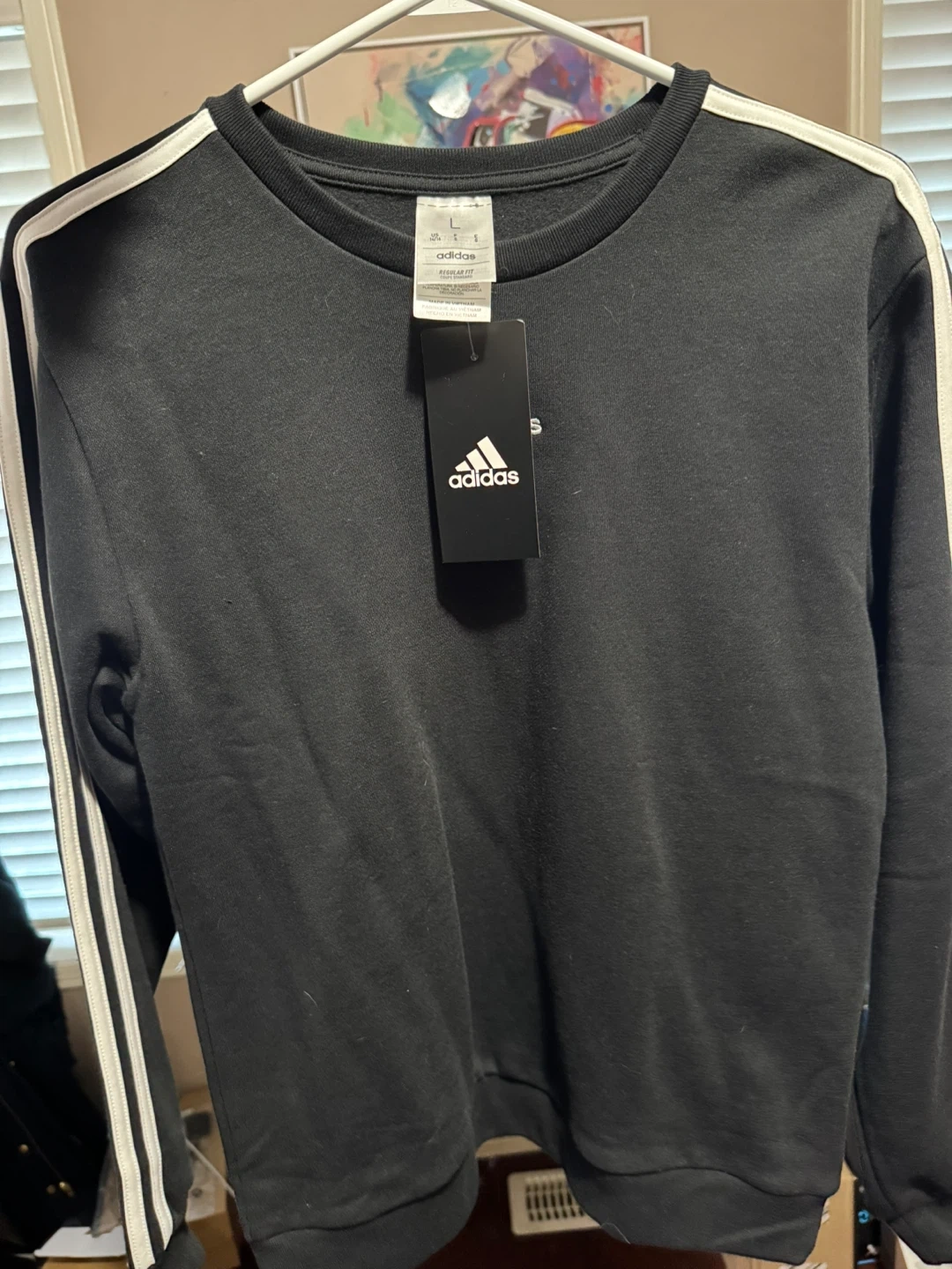 Selling a black Adidas long sleeve sweater. New with tags. It's in great condition and features the classic three stripes on the sleeves! Perfect for casual wear