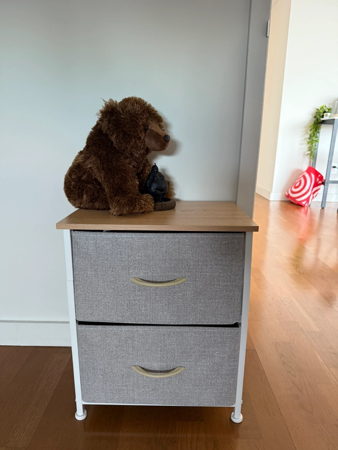 I'm selling a 2-drawer storage dresser. It features a light wood top and gray fabric drawers with light-colored handles. Great for adding extra storage to any room