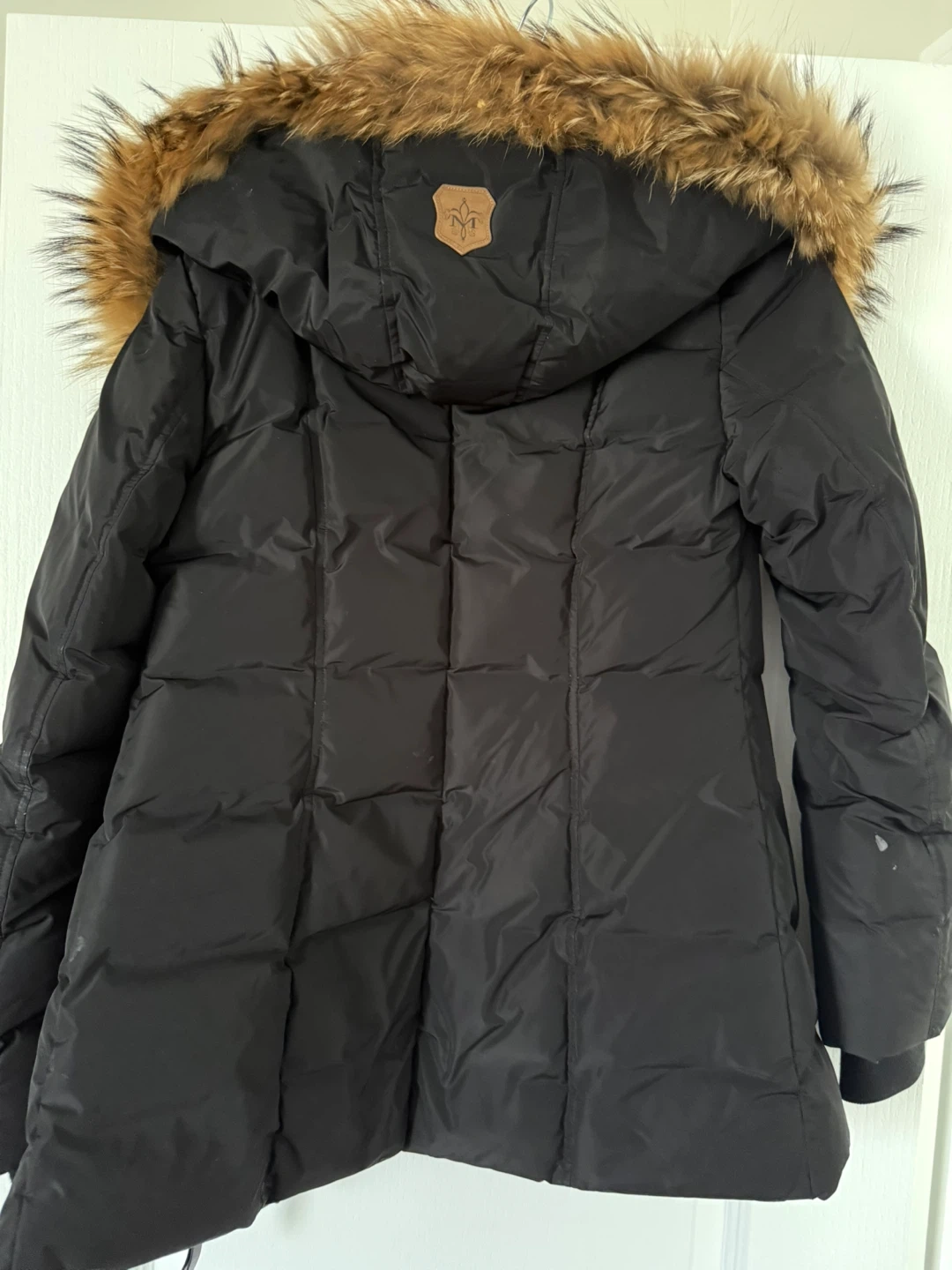 Selling a Mackage Montreal winter coat in black. It's a size small and has a fur-trimmed hood. Great for keeping warm during the cold Canadian winters!
