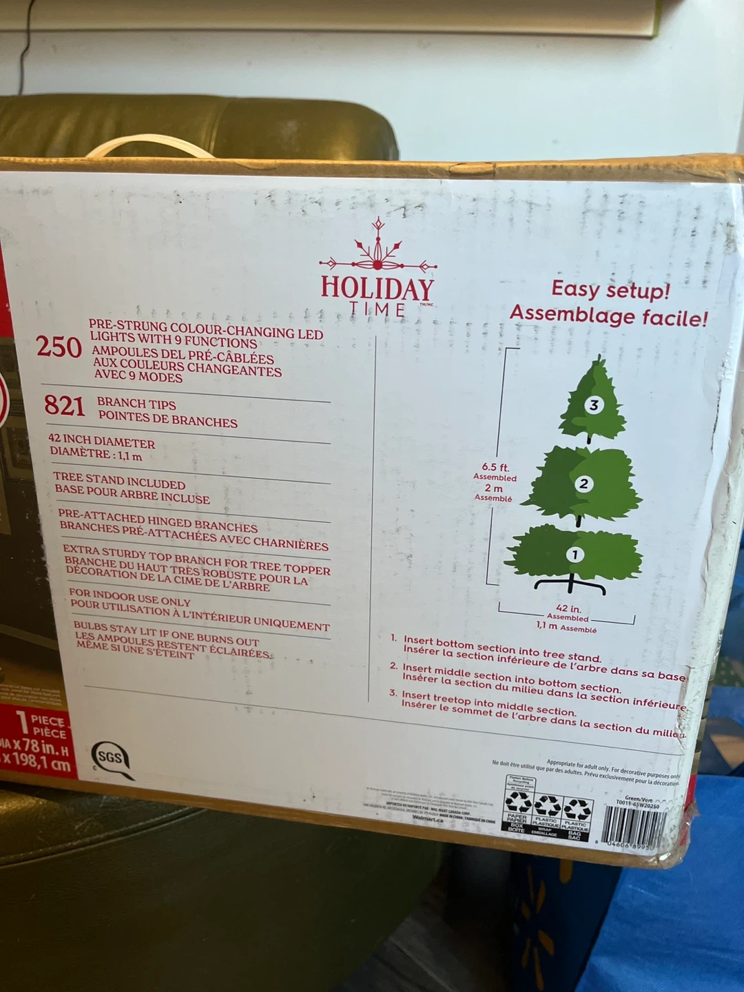 NEW Holiday Time 6.5' Pre-lit Flocked Frisco Pine Christmas Tree. Comes with pre-strung colour-changing LED lights with 9 functions. Also included are 821 branch tips and a tree stand. Easy to assemble. Originally bought for $149.98 Can also pick up at 250 Bloor St east wkdys 9-3