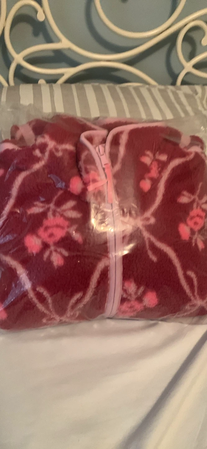 This is a printed loose sherpa quarter-zip pullover! It's super comfy and perfect for chilly days. The unique print adds a touch of style, and the quarter-zip makes it easy to layer. It's in great condition and ready for a new home can show proof of purchase