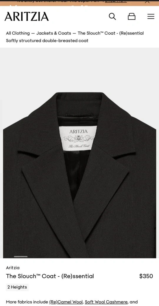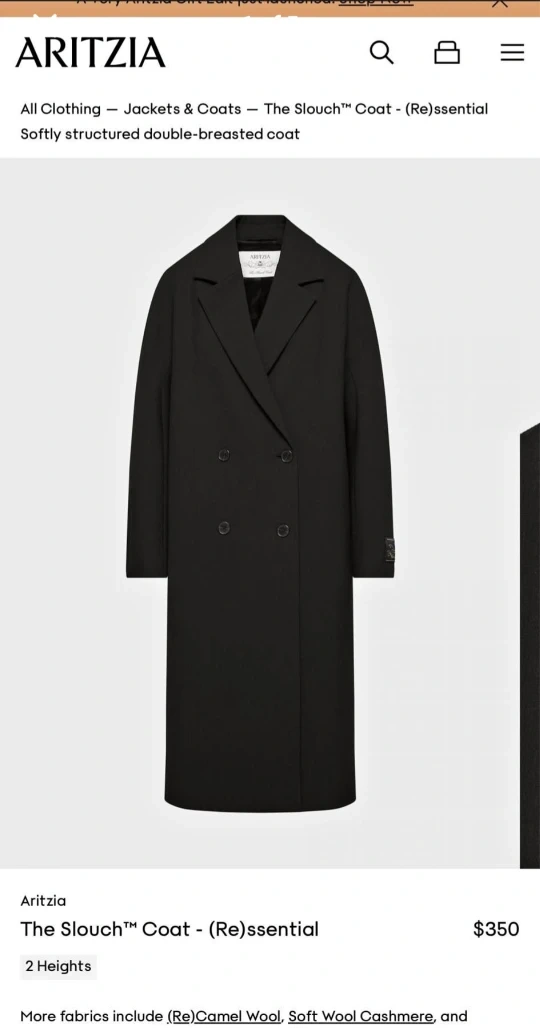 Buy & SellAritzia The Slouch Coat - (Re)ssential Black - MAritzia The Slouch Coat - (Re)ssential Black - M$180Selling an Aritzia The Slouch Coat in black, size medium! This is the (Re)ssential version. Originally bought for $350 before taxConditionGoodSizeMedium1 chats·1 favorites·39 viewsSELLERShazzJane Heights262 reviewsWHERE TO MEETYorkdale Shopping Centre