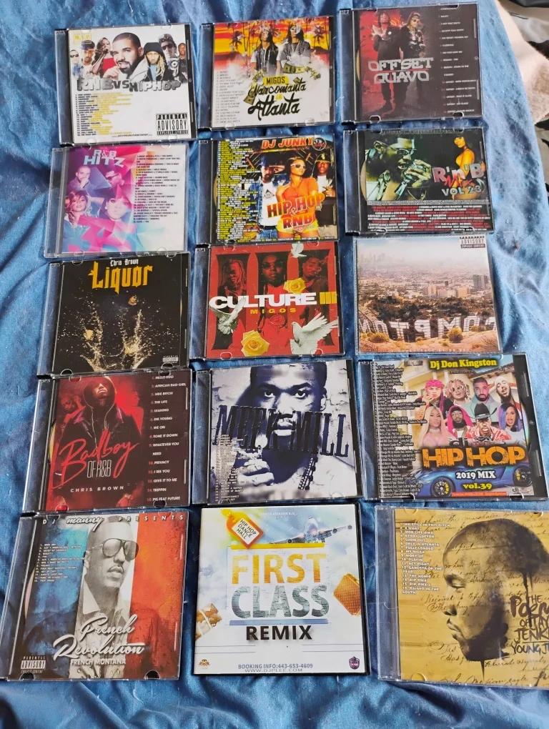 35 CD's for $20! have hundreds of CD's! Tell me what Artists? u looking for! have Migos! Chris Brown! Dr.Dre! Jezzy! Drake! Quavo! French Montana! Offset! etc. Lots of Mixed Rap Artists & Mixed R&B & Mixed Dancehall hits!