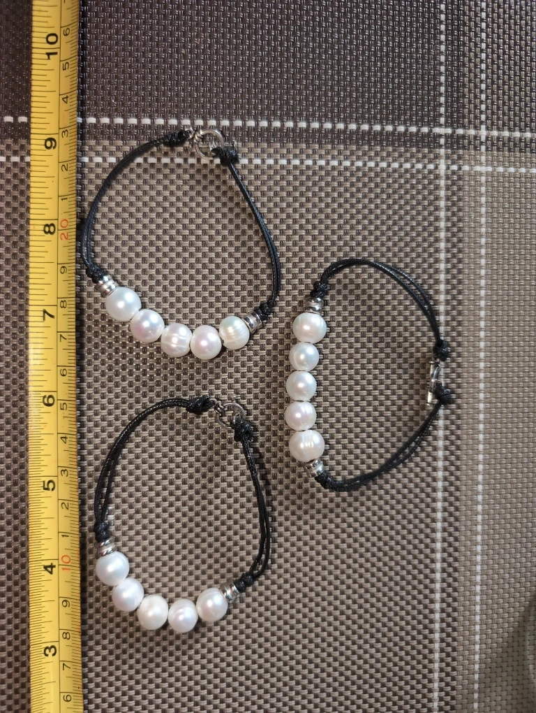 They feature lustrous white pearls strung on a black cord with silver-tone accents.
