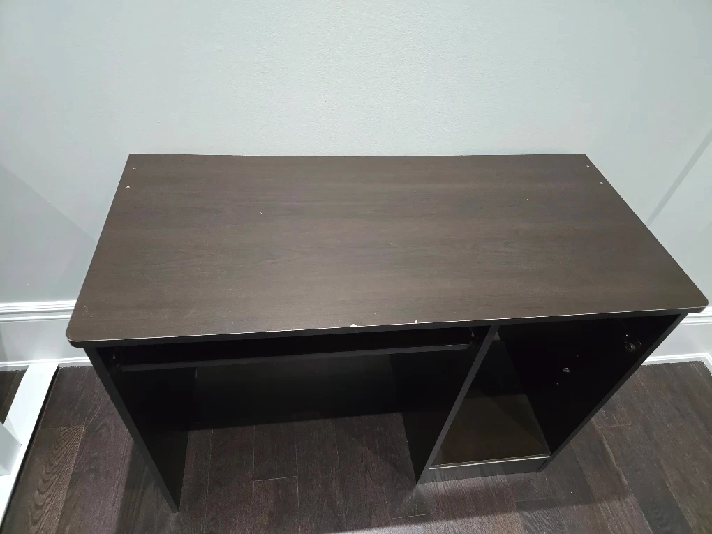Selling a dark brown computer desk! It has a pull-out keyboard tray and a storage compartment on the side. It's in good condition and perfect for a home office or study space