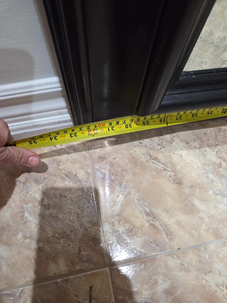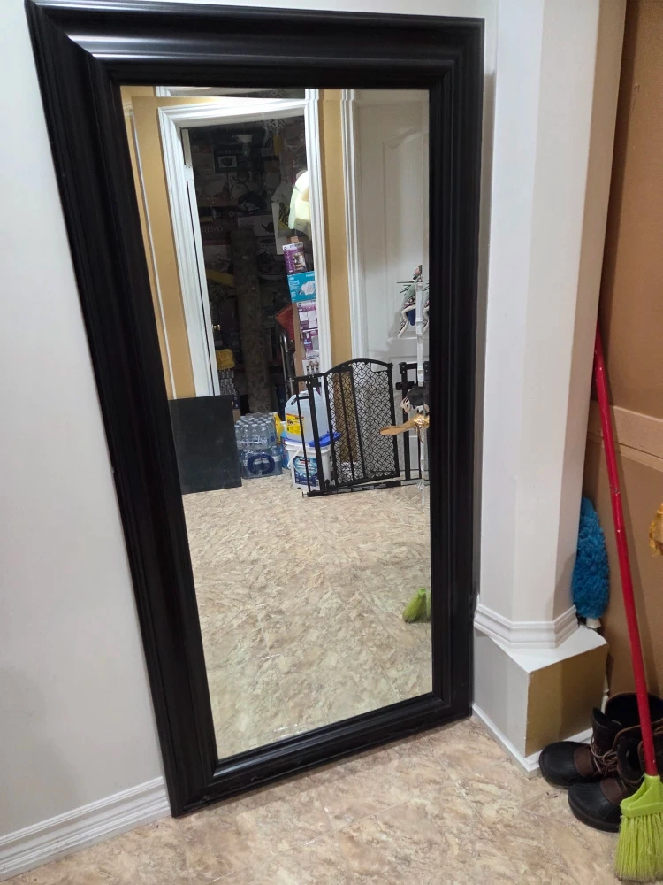 Selling a large mirror with a black frame. It measures approximately 34 inches wide and 67 inches tall. It's a great statement piece for any room!