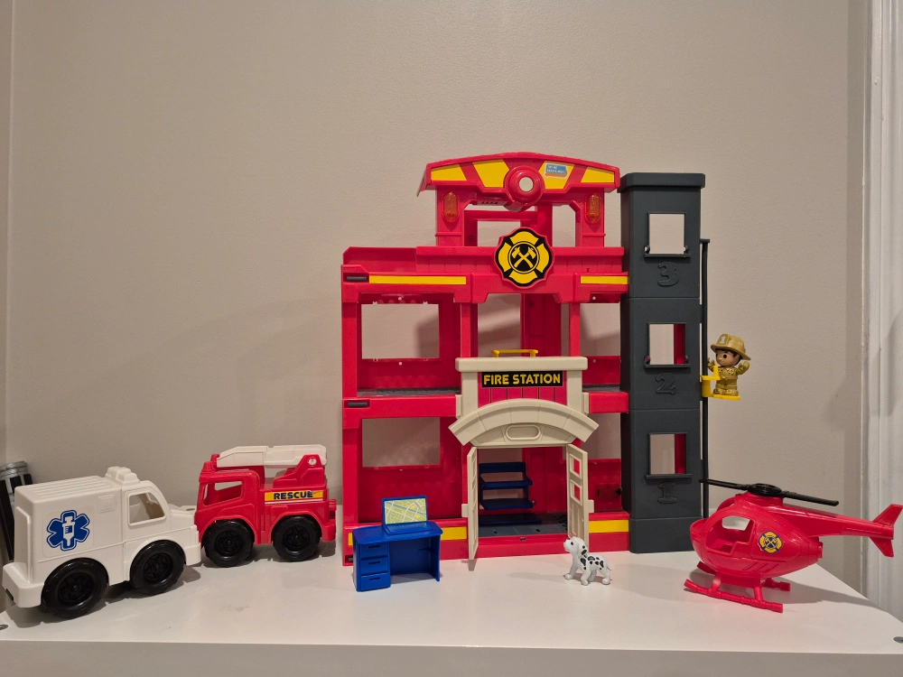 Little People Fire Station playset with various vehicles and accessories. Includes an ambulance, fire truck, helicopter, and a Dalmatian figure. Great for imaginative play!