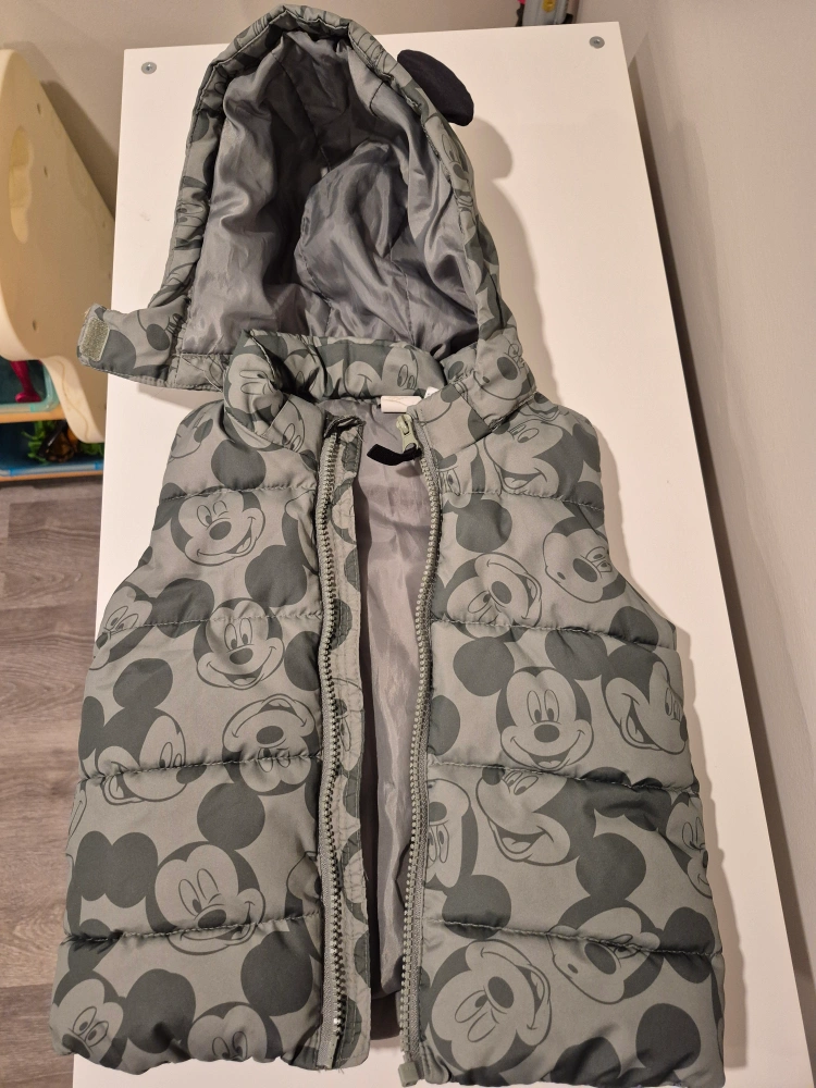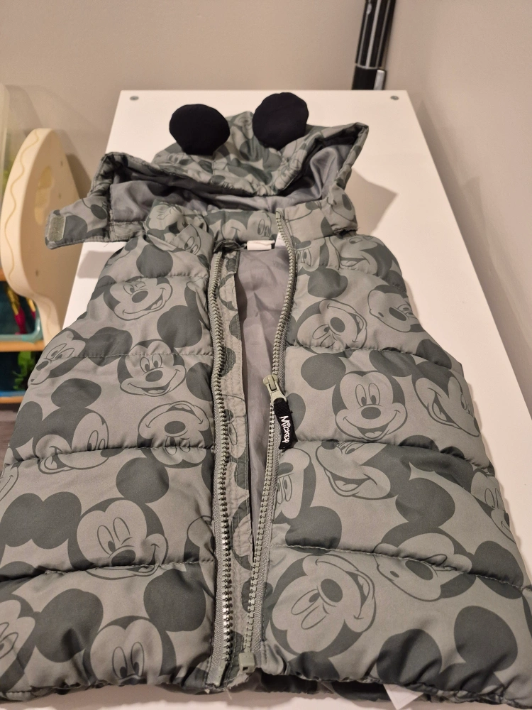 Cute Mickey Mouse themed padded vest for kids! It's in great condition and features a fun Mickey Mouse pattern all over. The vest also has a hood with adorable Mickey Mouse ears. Perfect for keeping your little one warm and stylish!
