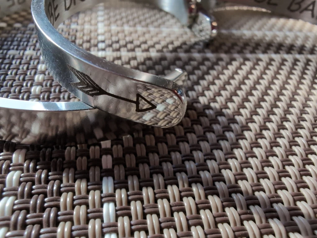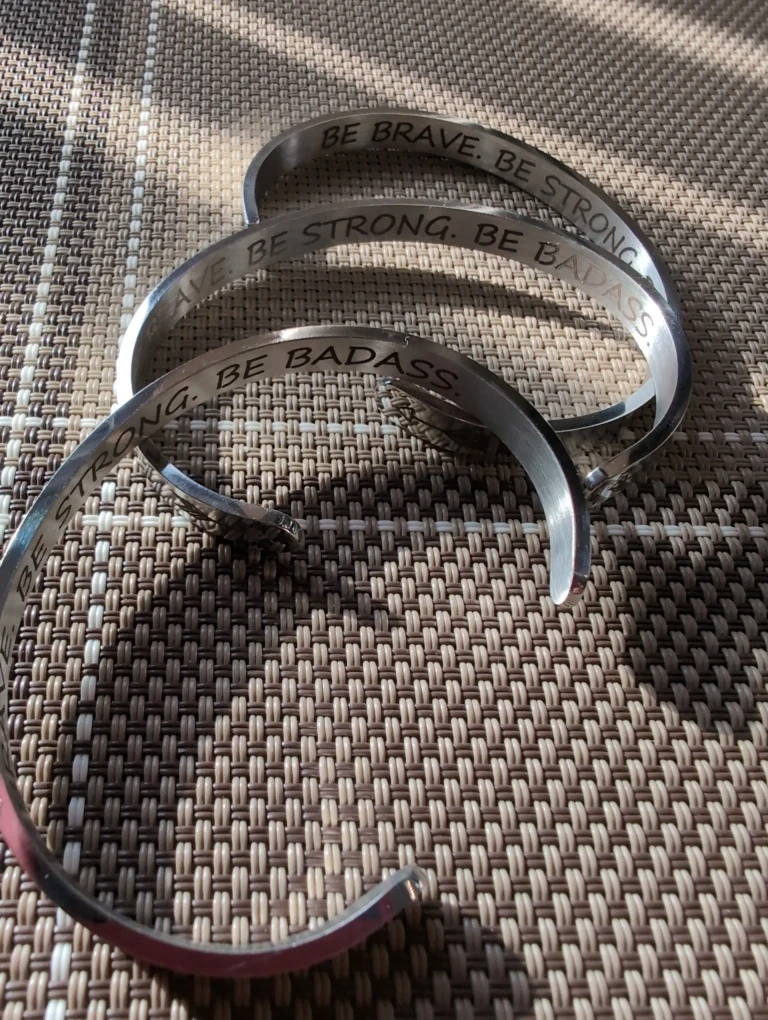 These silver-toned cuff bracelets are engraved with inspirational messages: "Be Brave", "Be Strong", and "Be Badass"! They feature an arrow design on the ends as well