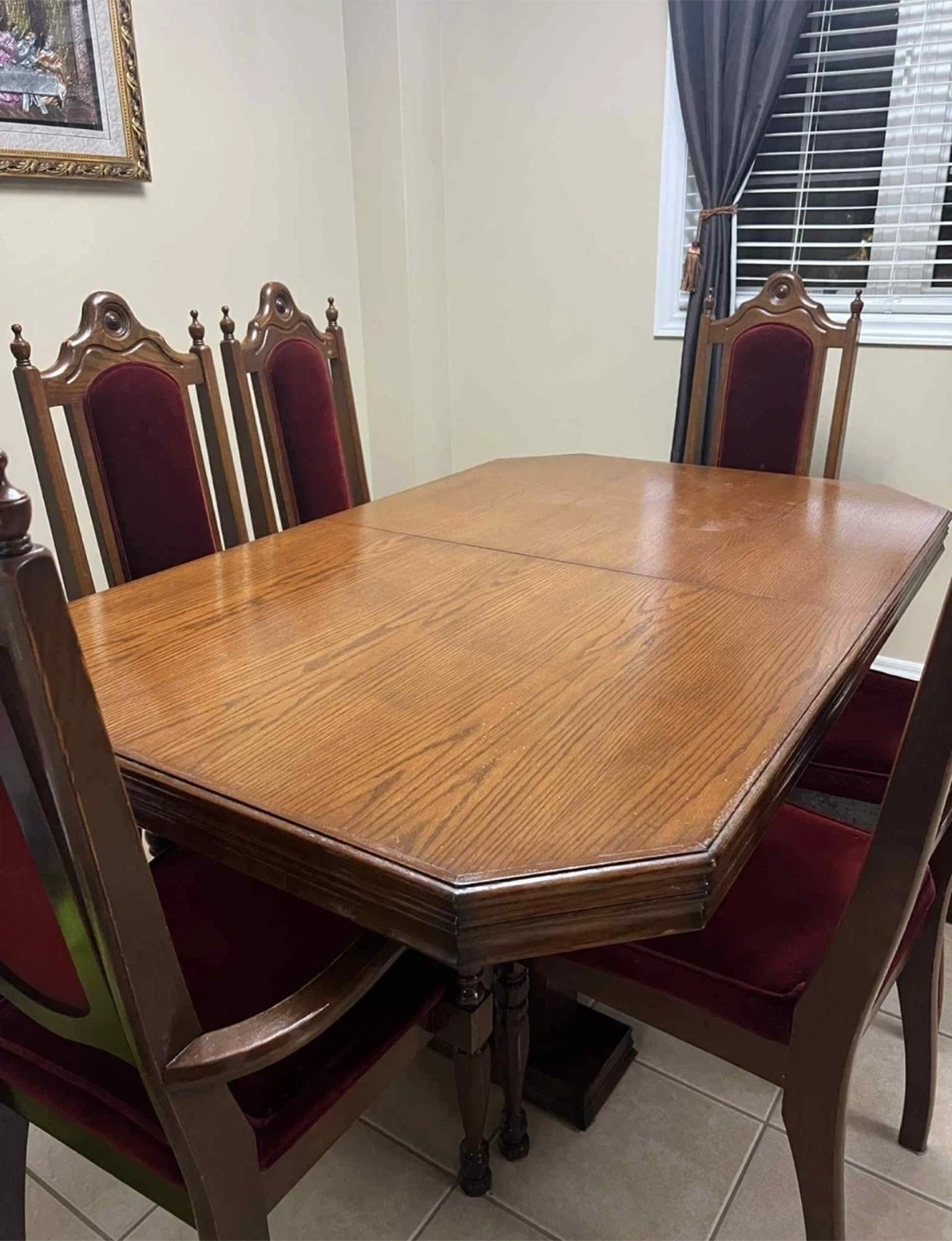 Selling a dining table with six chairs. The table is an octagonal shape with wood finish and the chairs have a red velvet seat. A great set for any dining room!