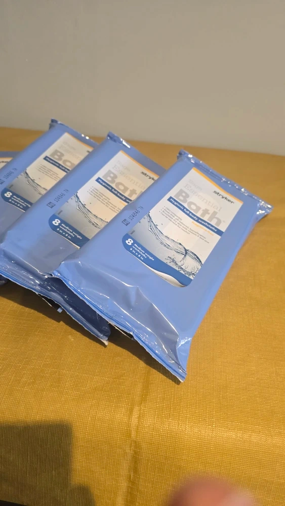 I have Stryker Sage Essential Bath hygienic full-body washcloths for sale! These are fragrance-free, rinse-free, pH balanced, and hypoallergenic. They're also designed to nourish dry skin with vitamin E and aloe, and can be warmed for comfort. Each pack contains 8 medium weight washcloths, sized 8 inches x 8 inches