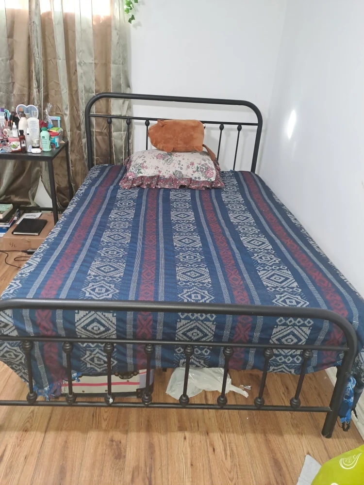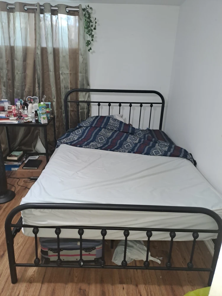 Selling a black metal bed frame with mattress. It's in great shape and ready for a new home. Perfect for adding a touch of modern style to your bedroom