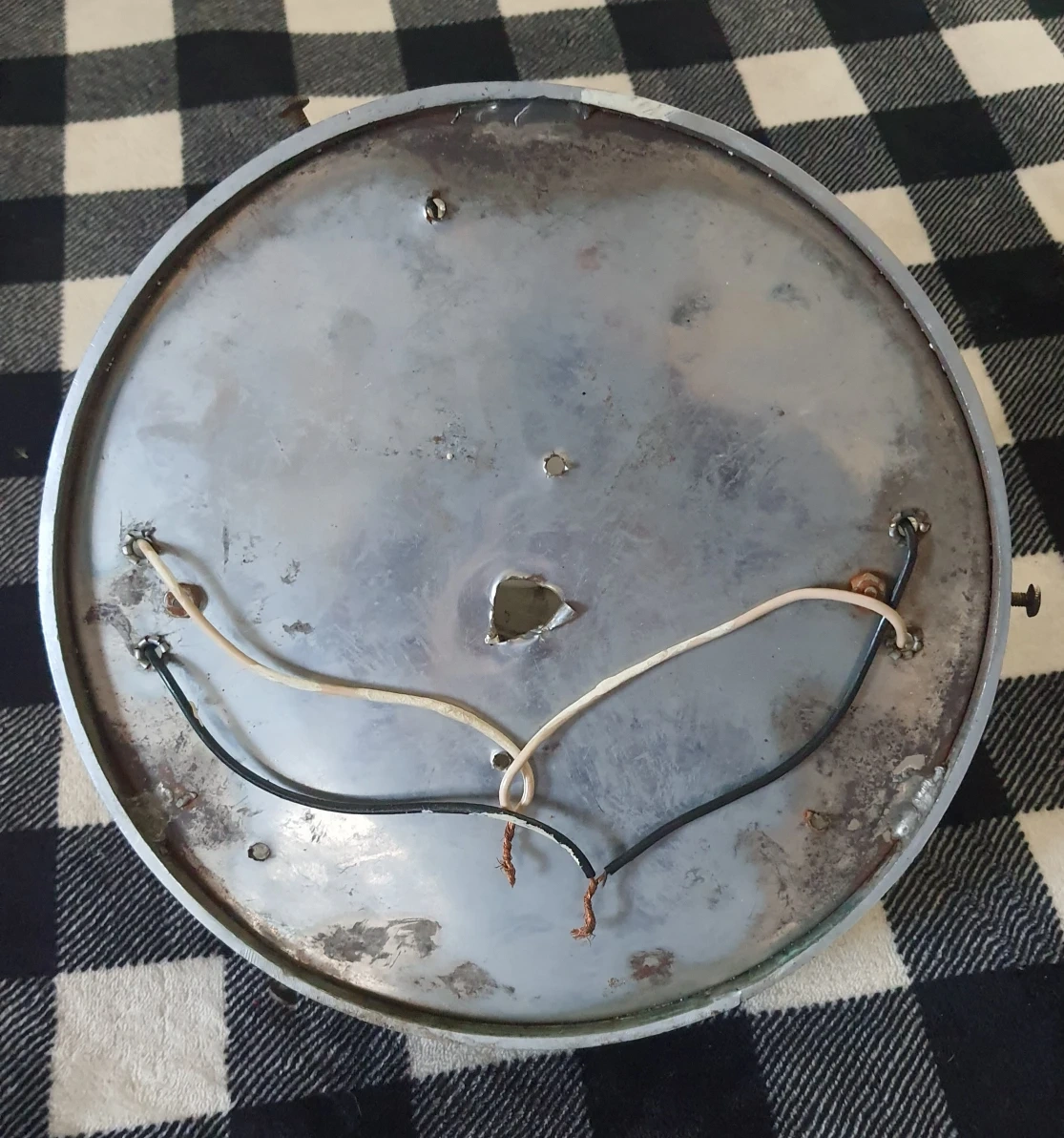 Selling a used ceiling light fixture. It has a beaded shade and a silver-tone base. The diameter of the base is approximately 10 inches. It shows some signs of use.