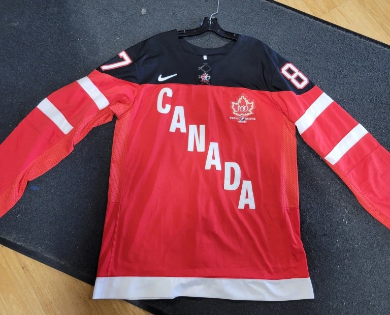 Selling a Nike Team Canada hockey jersey with Crosby's name and number (87). The jersey is red and black with white stripes on the sleeves. It also features the Canada logo on the front. Jersey size is XXL and has never been worn.