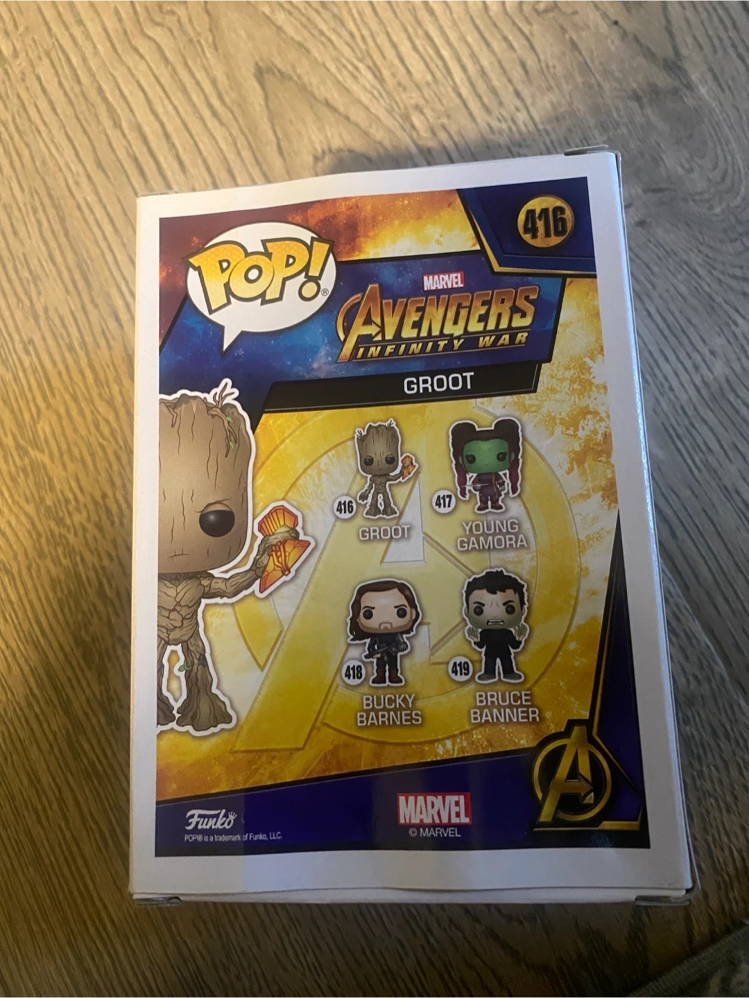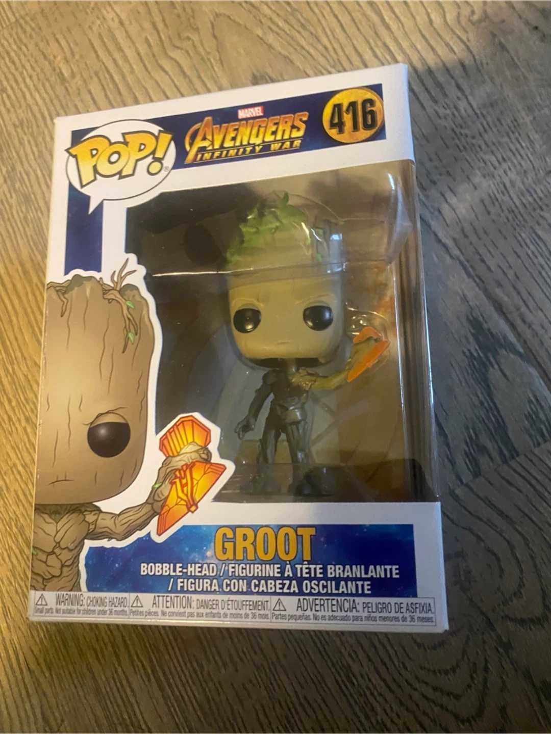 Selling a Funko Pop! figure of Groot from Avengers: Infinity War. This is #416 in the Pop! Marvel series. It's still in its original box, so it's in great condition!