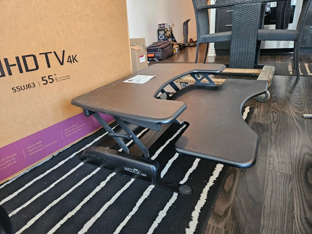 Selling a Varidesk adjustable standing desk! It's in good condition and ready to help you work comfortably from home. The desk is black and features a convenient adjustable height mechanism.