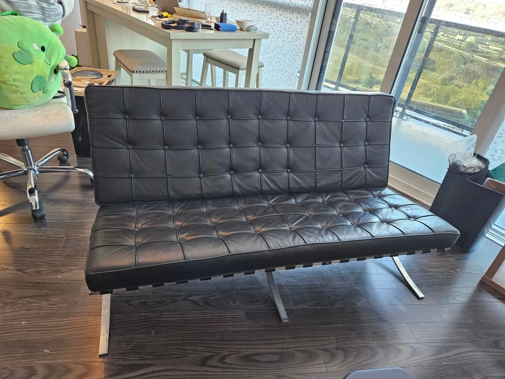 Selling a Barcelona-style bench in black leather. This stylish piece would look great in any living room or office space. It's in good condition and ready for a new home!