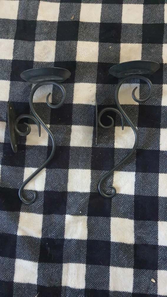 Selling a set of two metal candle holders. They're black and have a unique, swirly design. The height of each holder is about 9 inches.