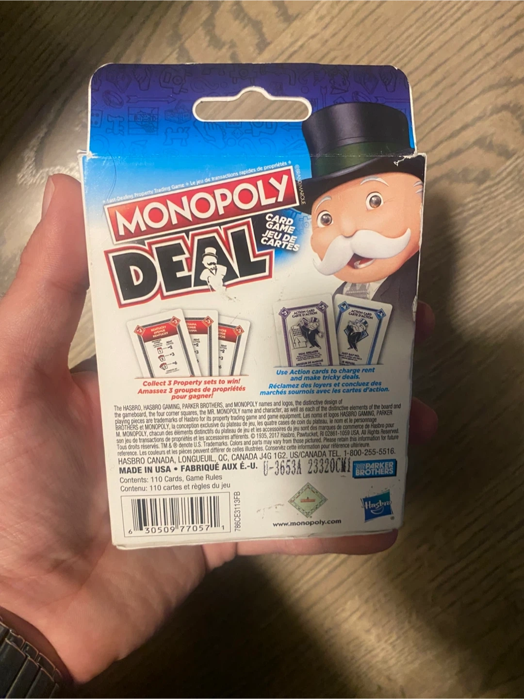 Selling a brand new, still-in-box Monopoly Deal card game! It's a fast-dealing property trading game that can be played in just 15 minutes. Perfect for ages 8+ and for 2-5 players. Contains 110 cards and rules.