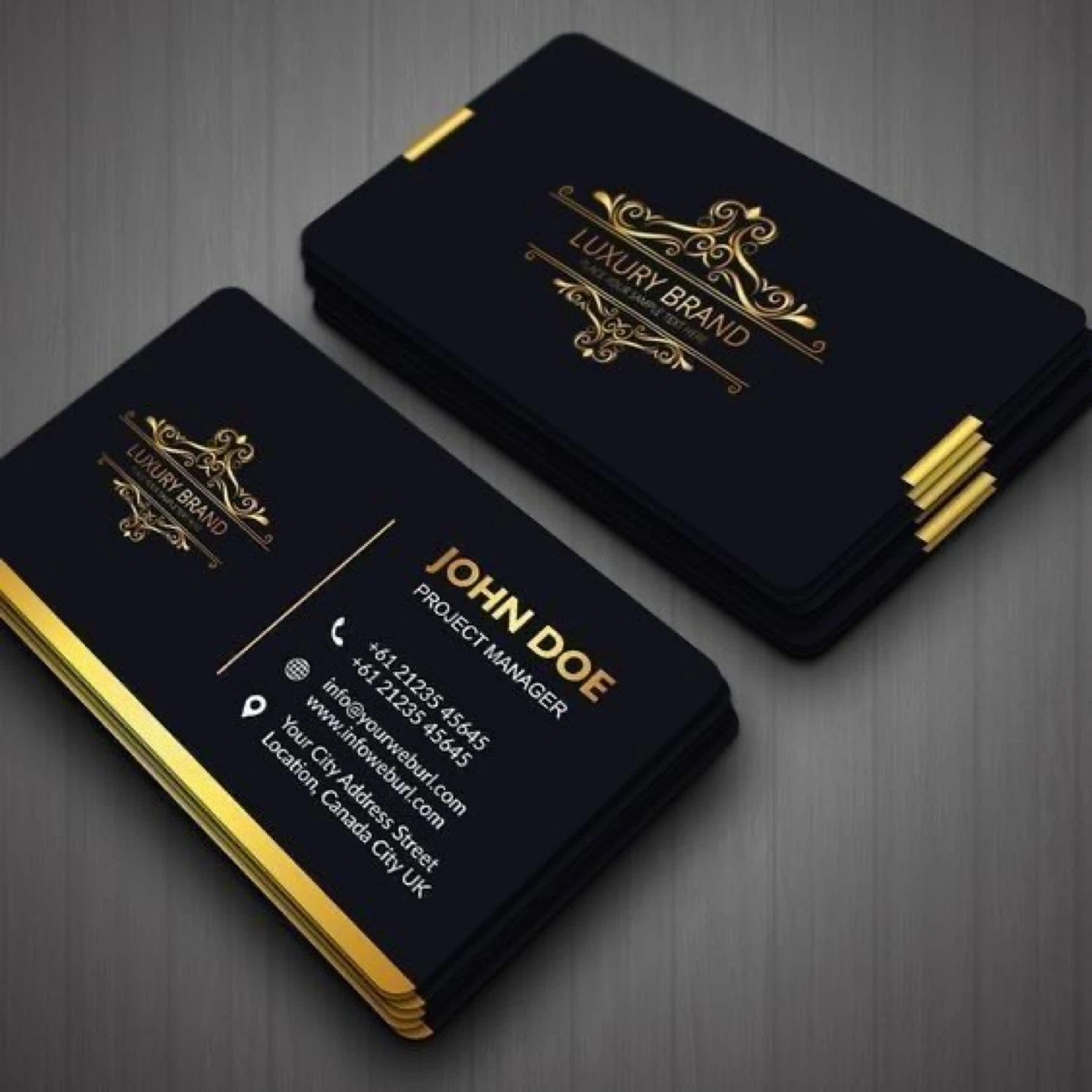 Set of luxury brand business cards. Features a sleek black design with gold accents. Order from discountstore365.ca