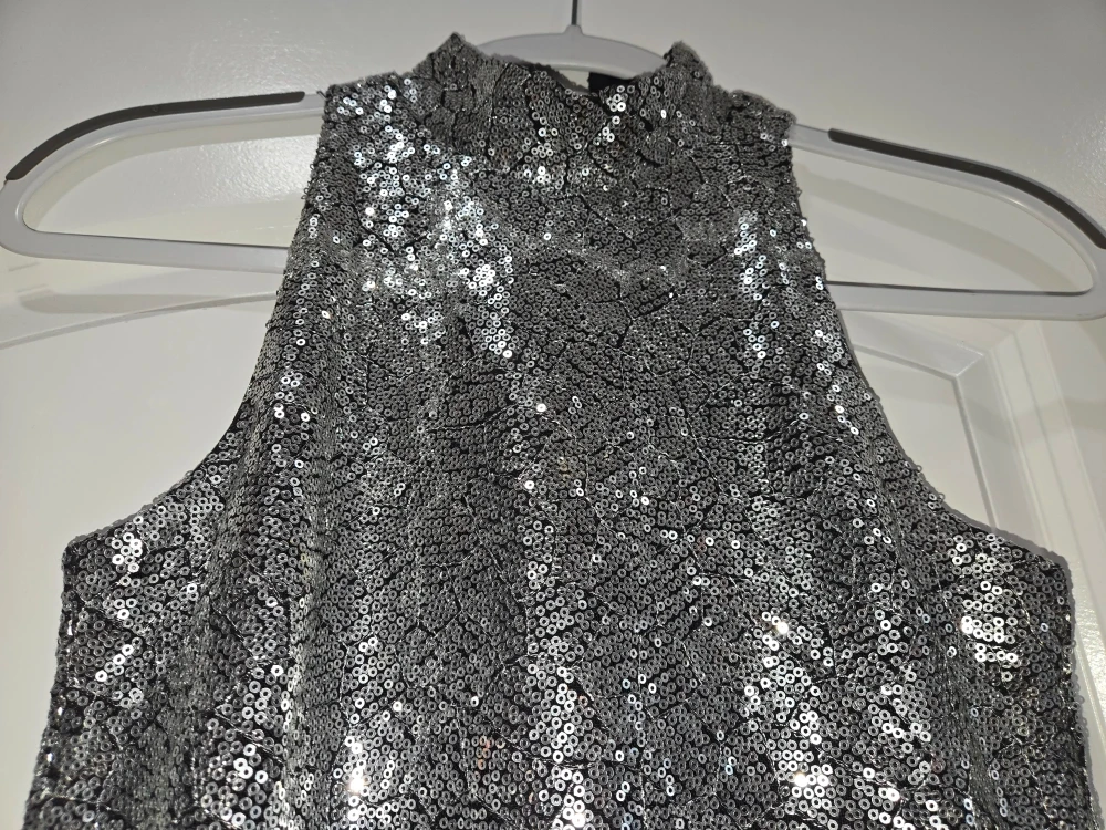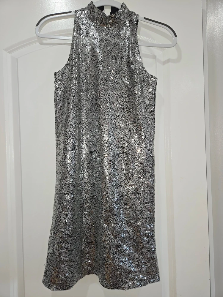 Here's a sparkly ELLE RW&CO dress! It's covered in sequins and perfect for a night out or Christmas Party. The dress is a size XXS.
