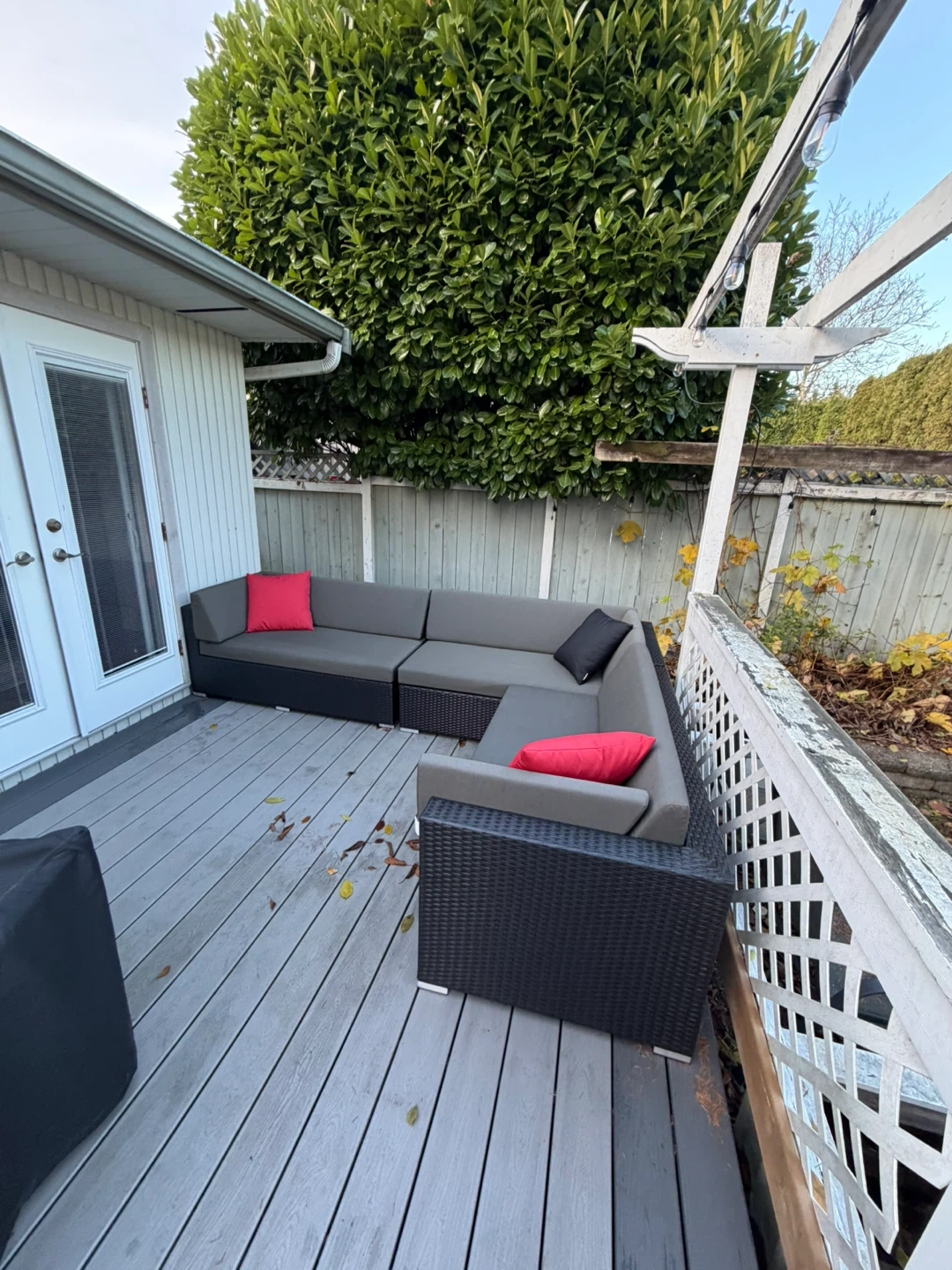 Selling a gently used outdoor sectional sofa. It's a great addition to any patio or deck! The set includes multiple pieces that can be arranged to fit your space. It features a grey colour and comfortable cushions. Comes with custom tarps
