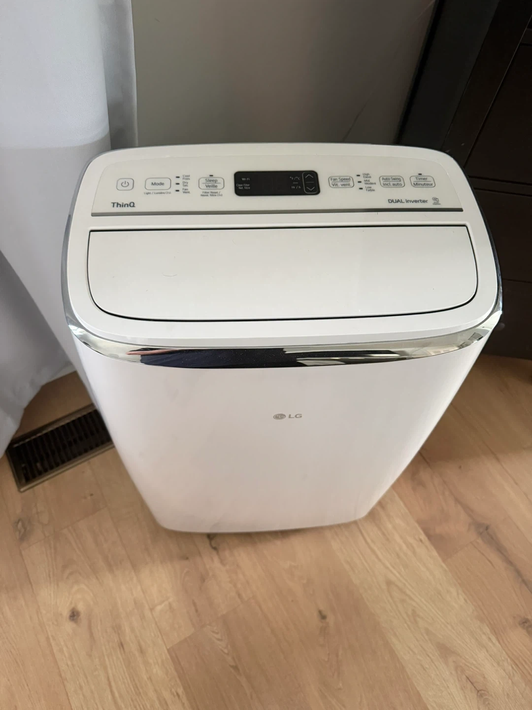 Selling an LG ThinQ portable air conditioner with Dual Inverter technology. It's in good condition and ready to keep you cool this summer! Features include multiple modes, sleep veille, fan speed control, auto swing, and a timer