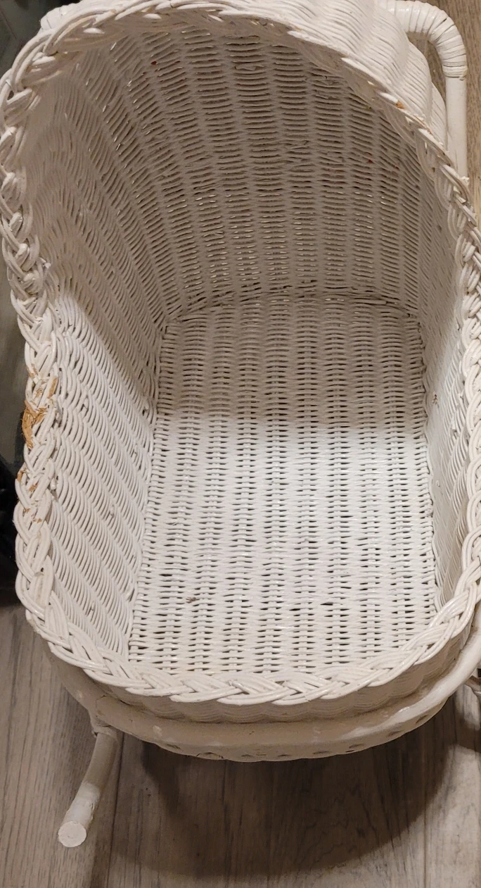 Selling a cute white vintage wicker baby basket. It's in good condition and perfect for your little one's dolls or stuffed animals! It's made of wicker and painted white.