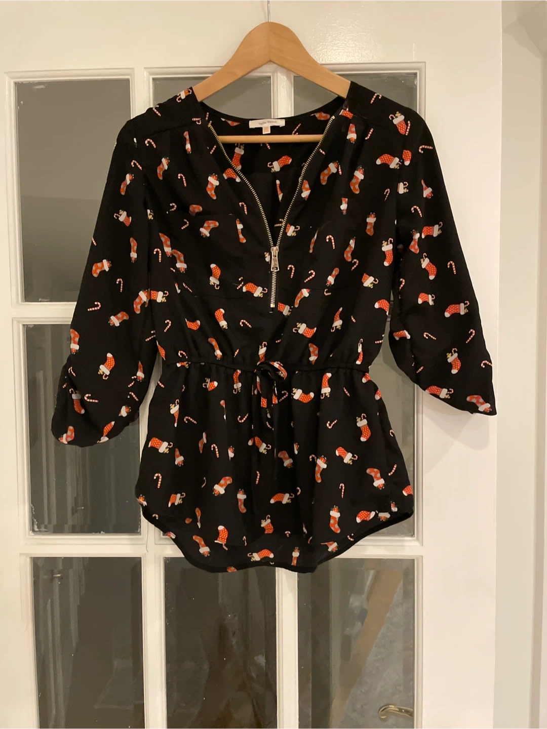 Festive blouse with a Christmas stocking and candy cane print! It features a zip-up front and a drawstring waist. Perfect for the holidays!