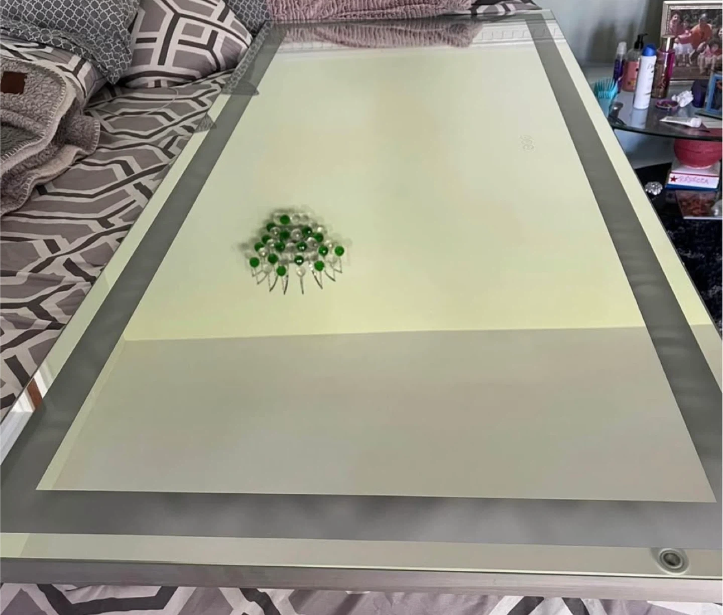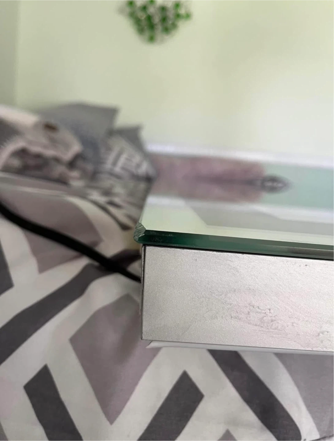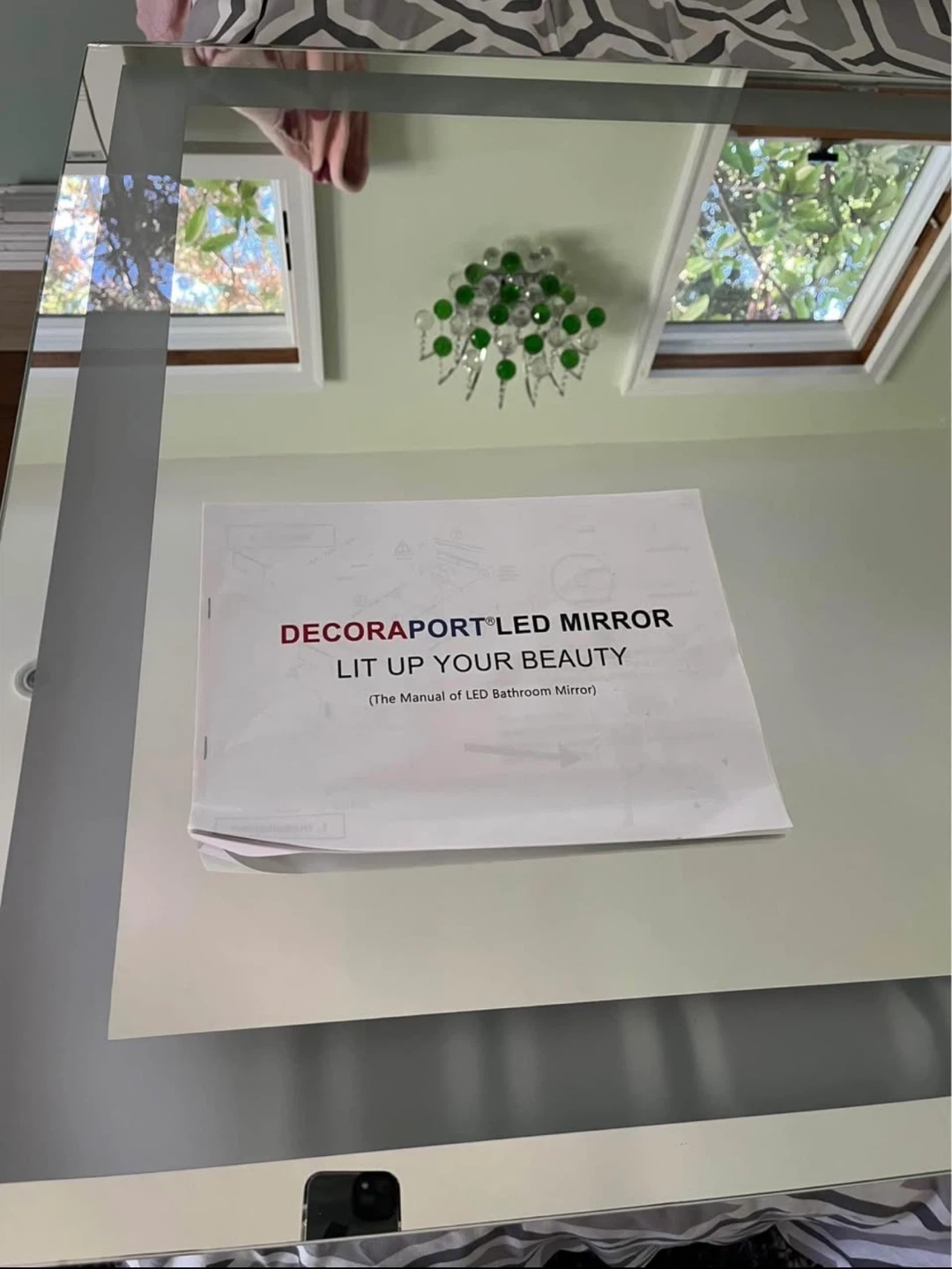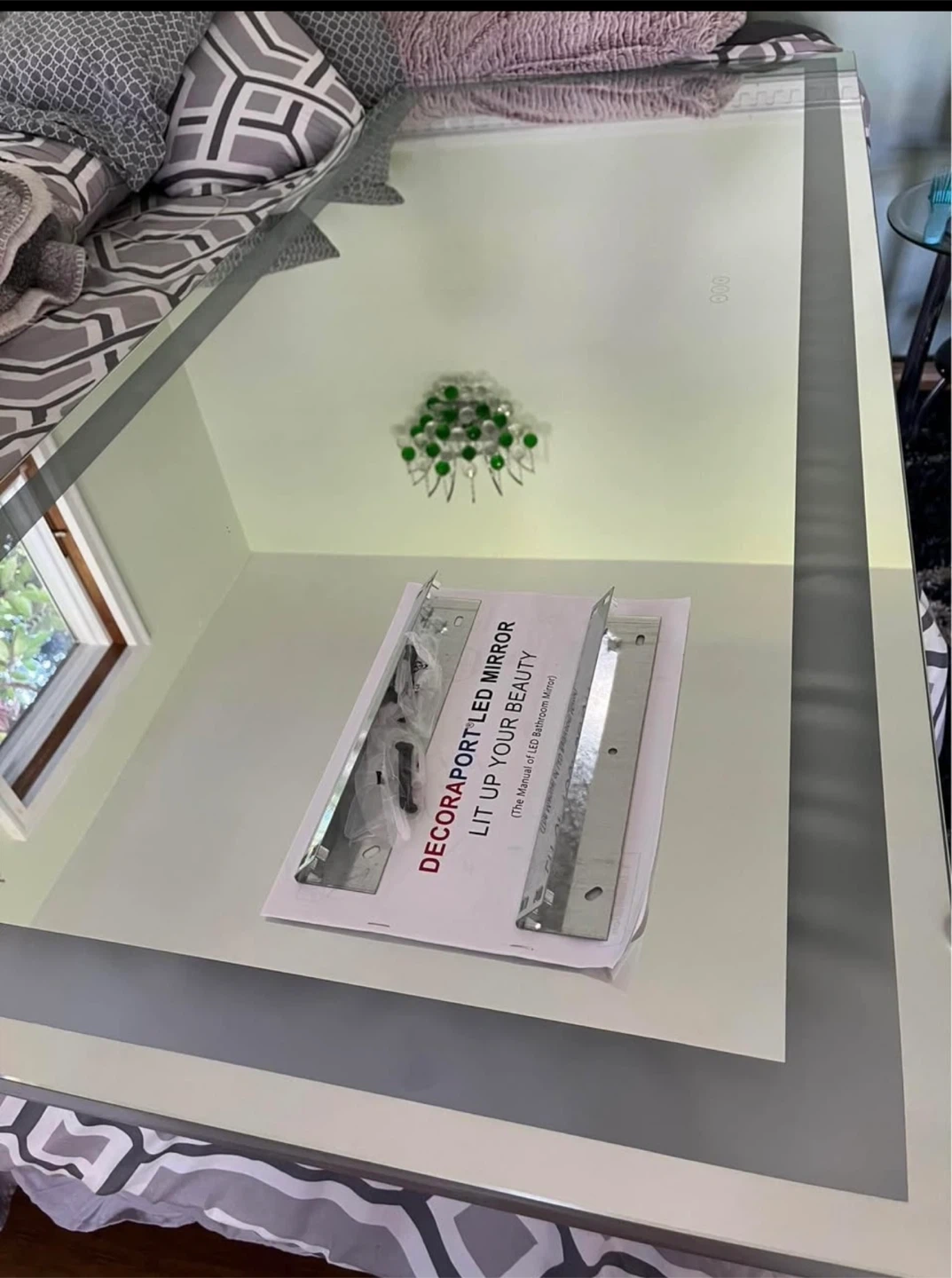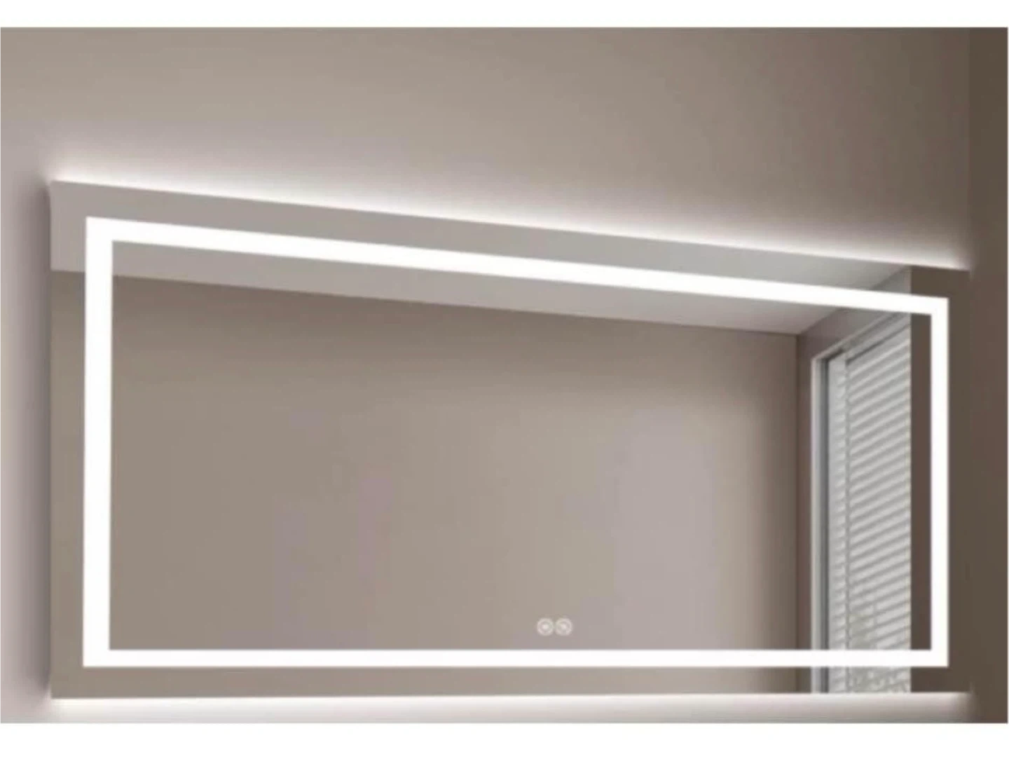 Here's an LED backlit bathroom vanity mirror. There are some signs of wear, including a small chip on the side. Please see photos for details!