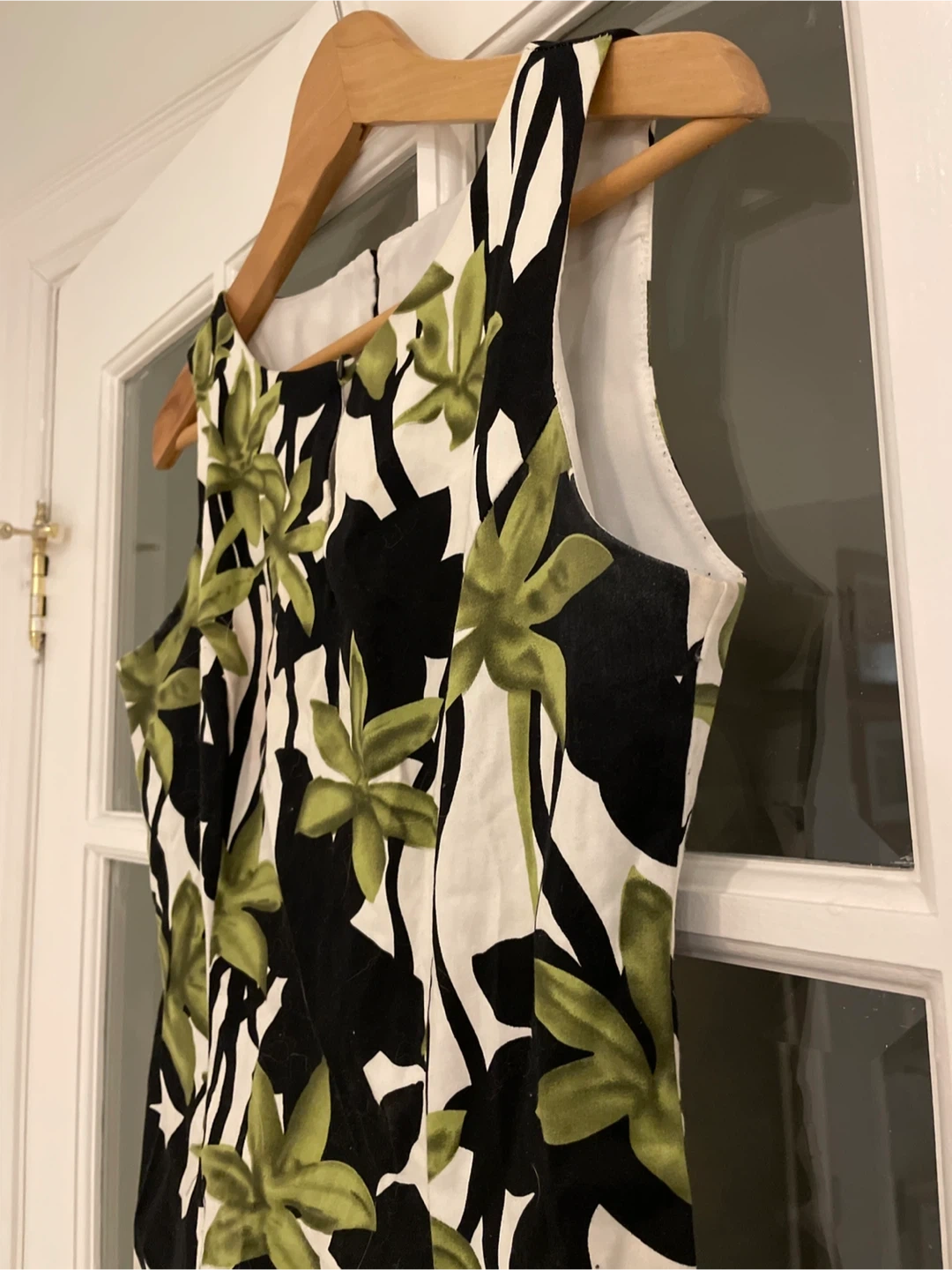 This is a lovely sleeveless dress with a vibrant floral print. It features a unique design with green and black flowers on a white background. Perfect for a sunny day out or a casual gathering! Laura Petites size 2P