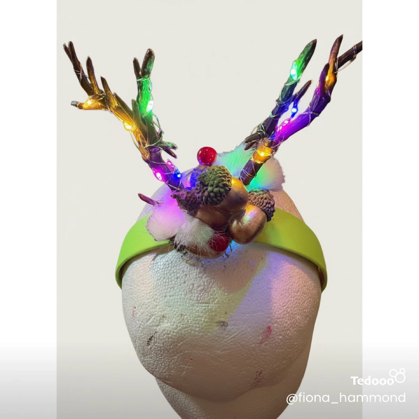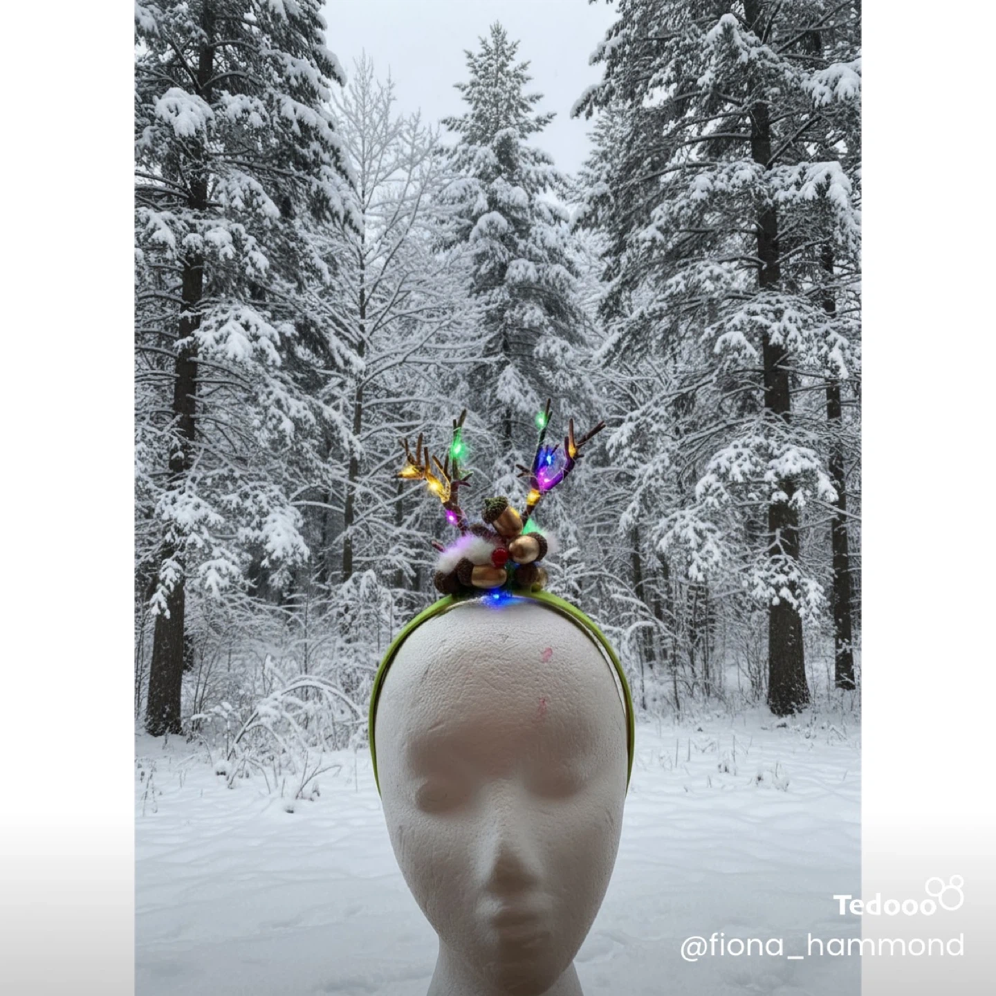 This is a cute, handmade reindeer antler headband, perfect for the holidays! It features colourful lights woven through the antlers, making it extra festive, as well as nuts, berries and snow.