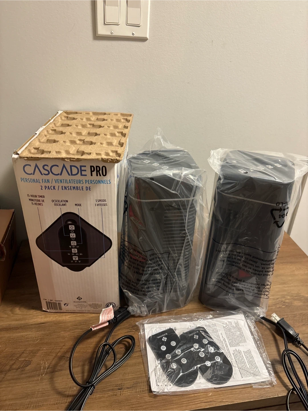 Selling a two-pack of Blackstone Cascade Pro personal fans! These are perfect for tabletops, nightstands, or your office. They feature 3 speeds, a 15-hour timer, and ultra-quiet oscillation. The box and included remotes are included!