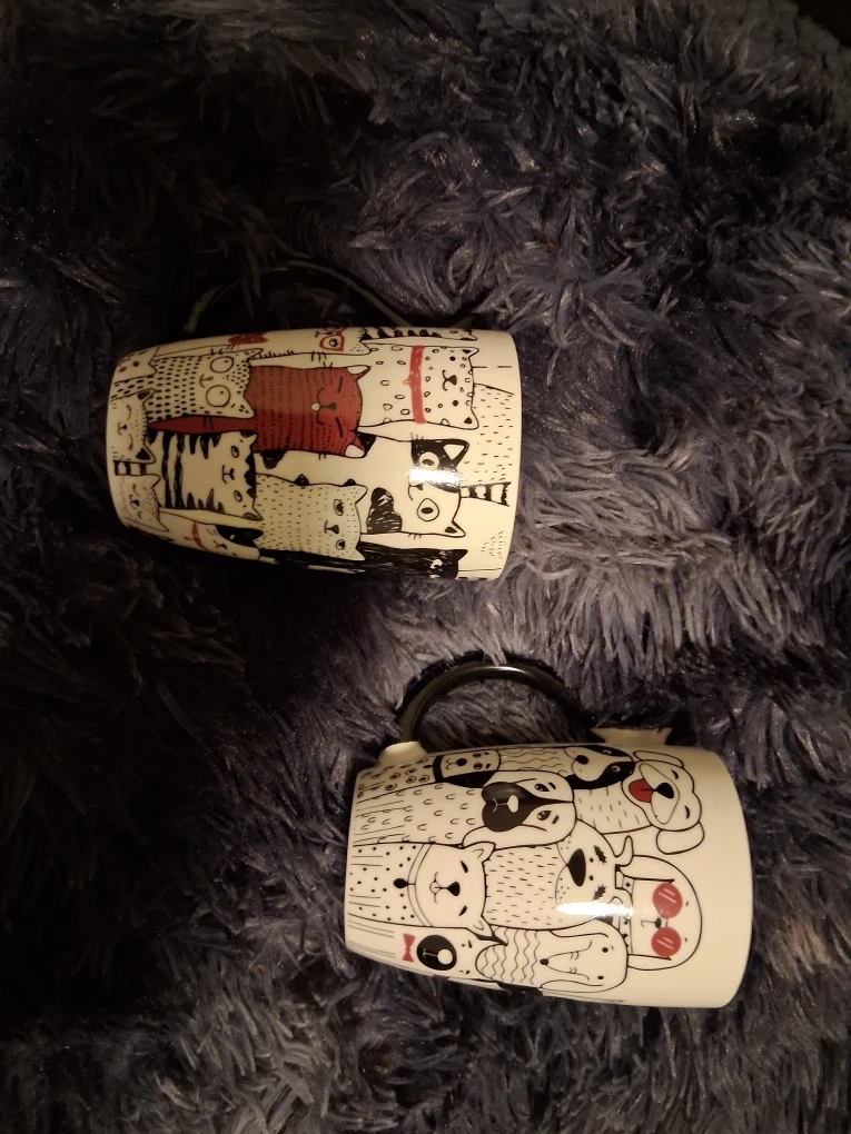 Selling a set of two mugs, one with a cute cat print and the other with an adorable dog print! Perfect for any animal lover to enjoy their morning coffee or tea in