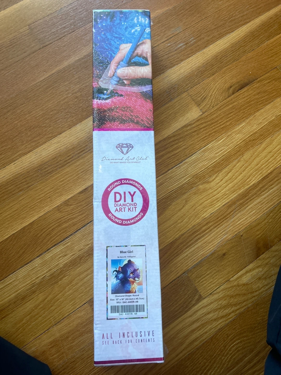Get creative with this Diamond Art Club Blue Girl DIY diamond art kit! It features a round diamond shape and measures 17" x 18" (42.6cm x 45.7cm). The kit includes a premium velvet tarpaulin canvas, color-coded resin diamonds, a magic diamond applicator, two wax pads, a craft tray, resealable baggies, and an inventory sheet with pre-cut sticker labels