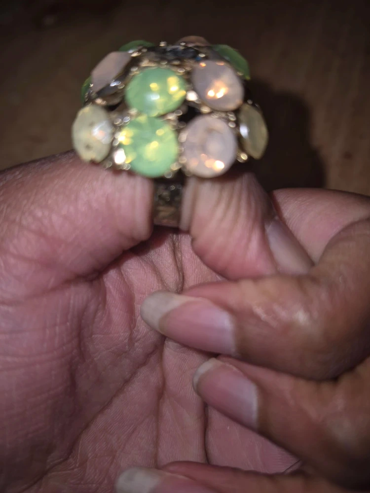 Selling a vintage gemstone cluster ring. The ring features a variety of pastel-coloured gemstones set in a cluster design. It has a unique and eye-catching look, perfect for adding a touch of vintage charm to any outfit