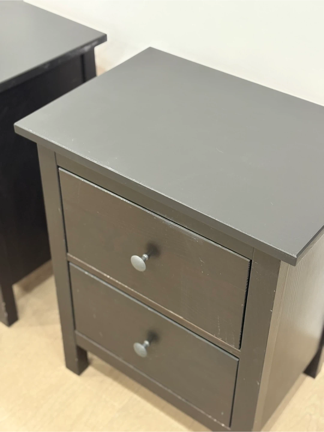 Selling a set of two nightstands! They each have two drawers for storage. One is brown and the other is black. They are in good condition and ready for a new home!