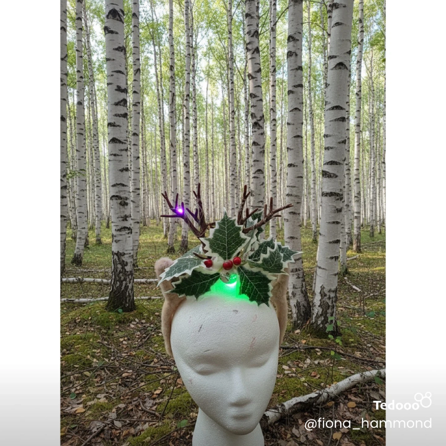 This is an antler headband that can be worn for the holidays. It has lights, holly, berries and glam. No one else at the party will be wearing this one of a kind creation!