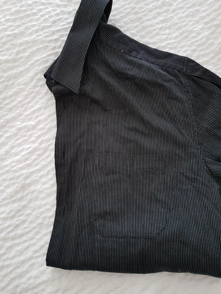 Here's a Perry Ellis Portfolio dress shirt in size L. It features a stylish black and white striped pattern. The shirt is made from 100% cotton and is wrinkle-free.