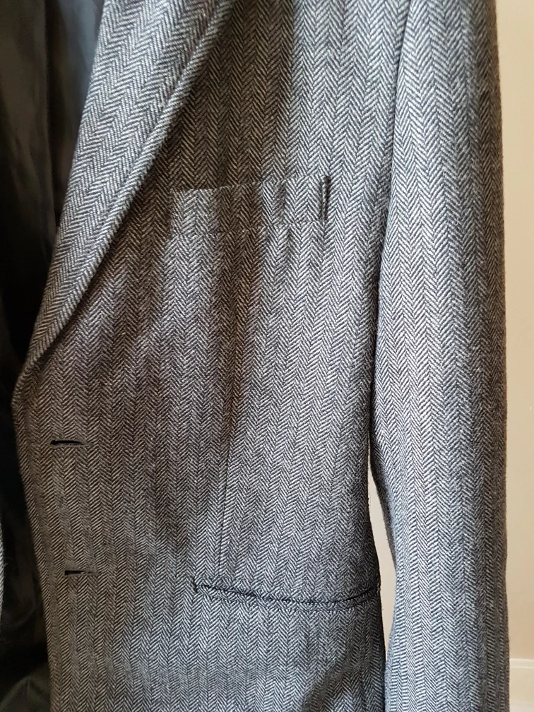 Selling a gently used UB herringbone blazer in size M. It's in great condition and perfect for a smart casual look. The blazer features a classic herringbone pattern and is made of a quality material. It's been well-cared for and comes from a smoke-free home