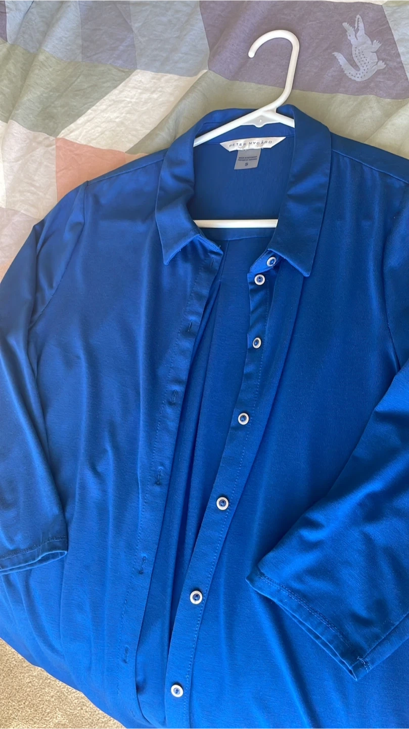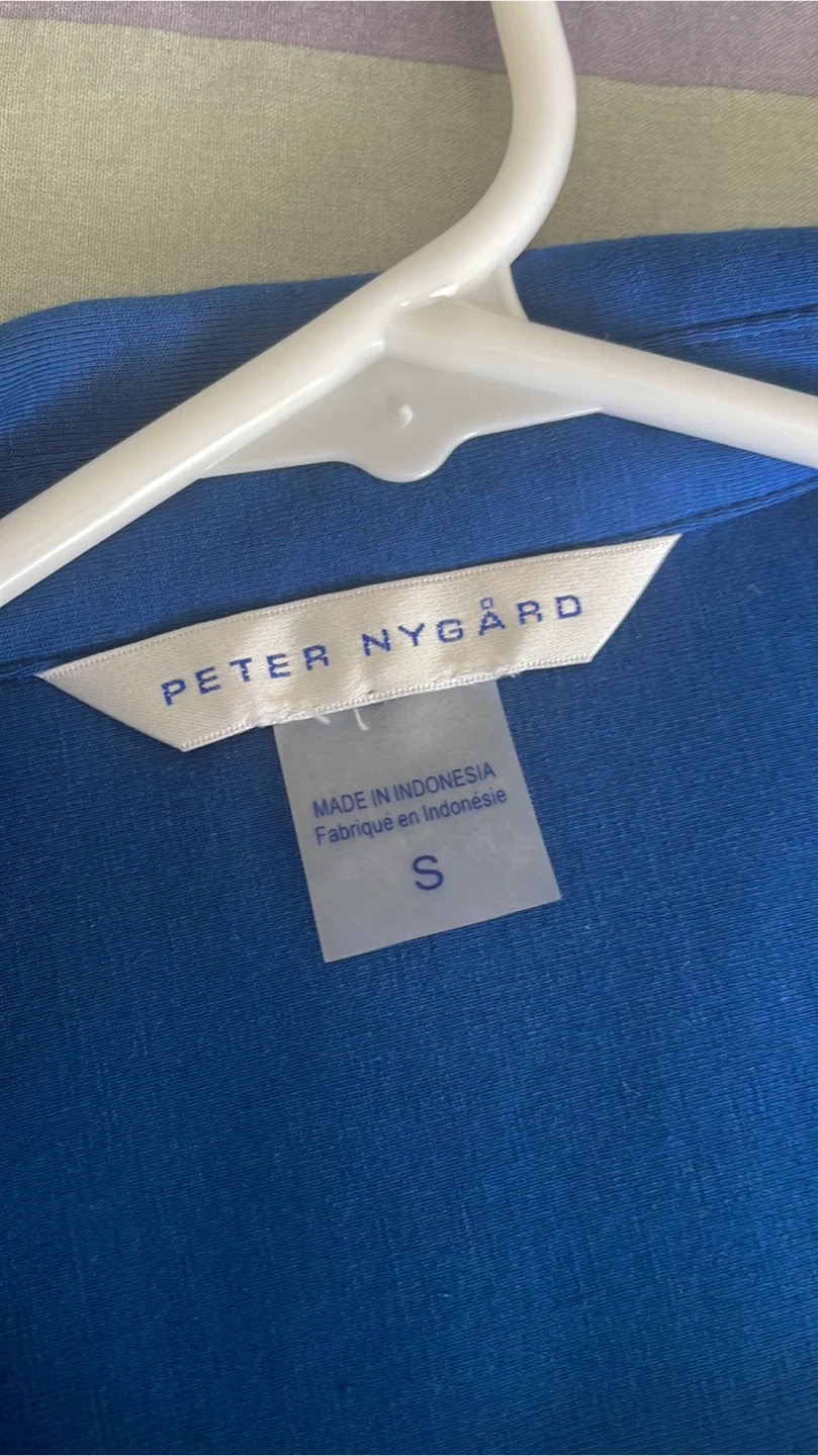 This is a Peter Nygård button-up shirt in a lovely blue colour! It's a size S/M. It's in great condition and ready for a new home.