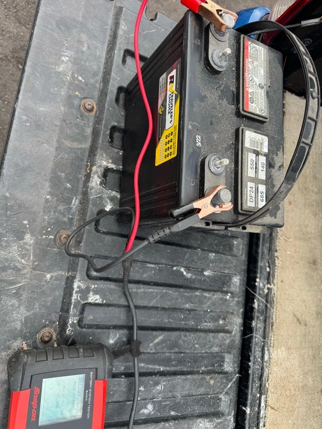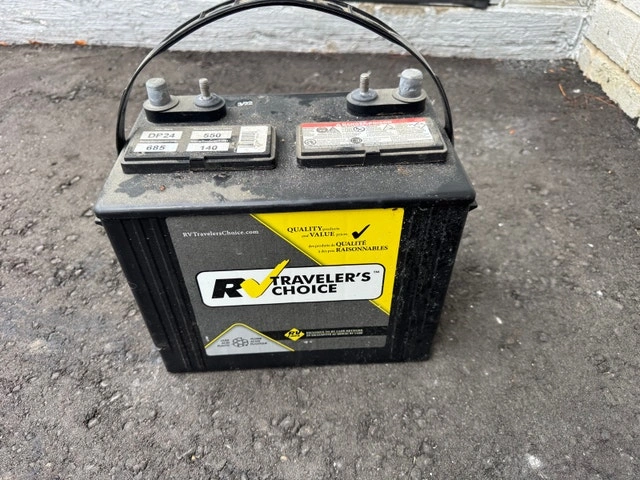 Great Condition. Deep Cycle 12V Battery. Features: - Brand: RV Travelers Choice - Part No.: DP24 - Approx. measurements: 10"W x 6.5"D x 8"H - Connectivity: screw down and post terminal connections - CCA rating: 550 - RC rating: 140 98% CCA (Like New) Barely used. Thanks.
