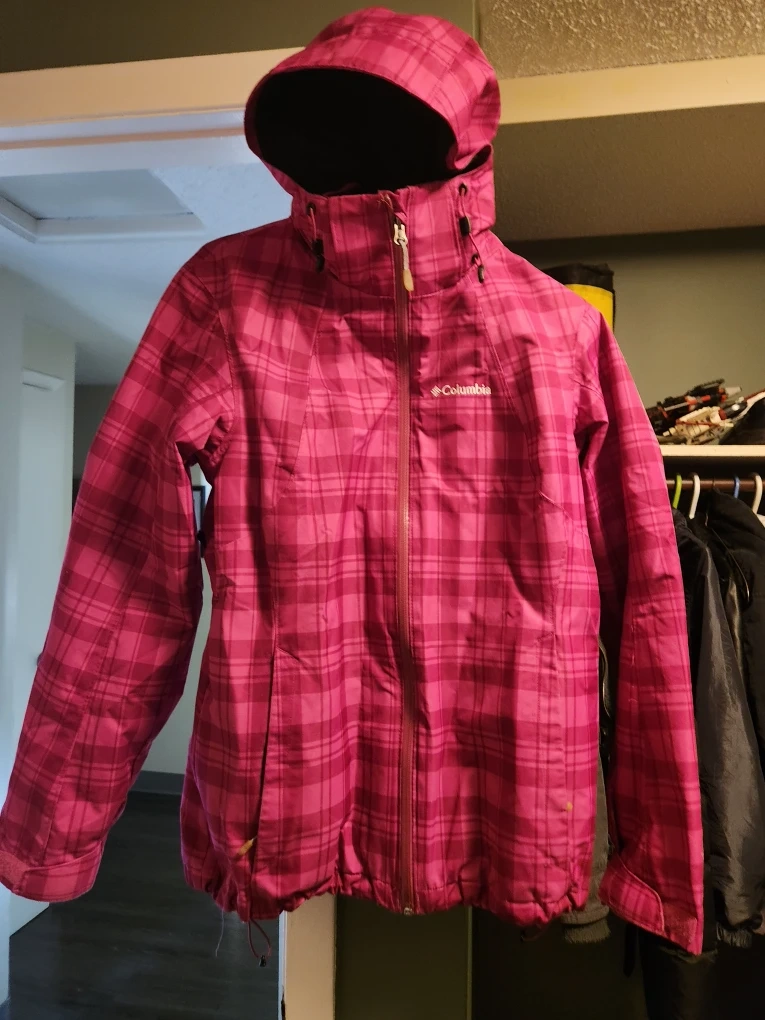 Selling a Columbia jacket in a pink plaid pattern. It's a size medium and in great condition. Perfect for layering or wearing on its own during milder weather!