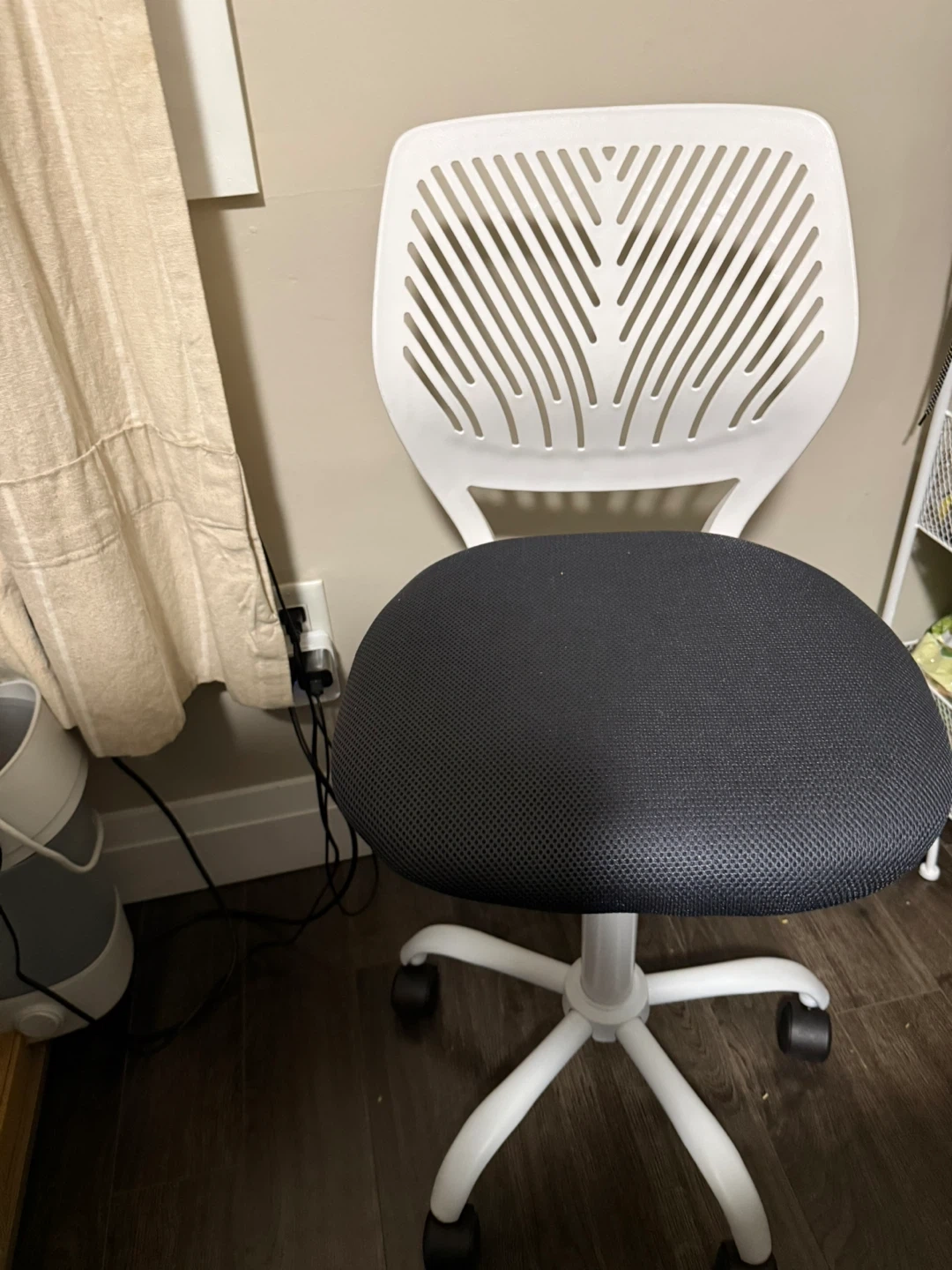 Selling an IKEA desk and office chair. The desk is white and measures approximately 73 cm (28 3/4") wide, 50 cm (19 3/4") deep, and 75 cm (29 1/2") tall. $50 for both chair and table.