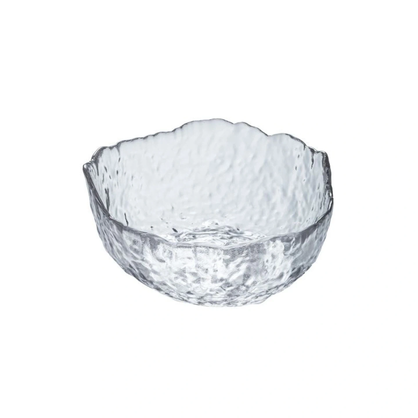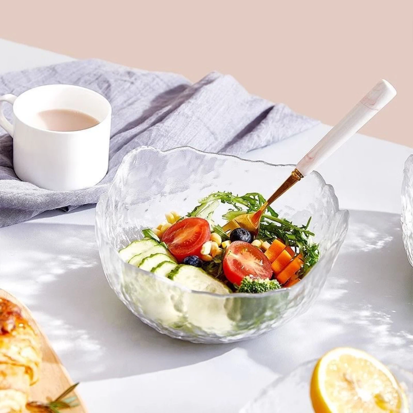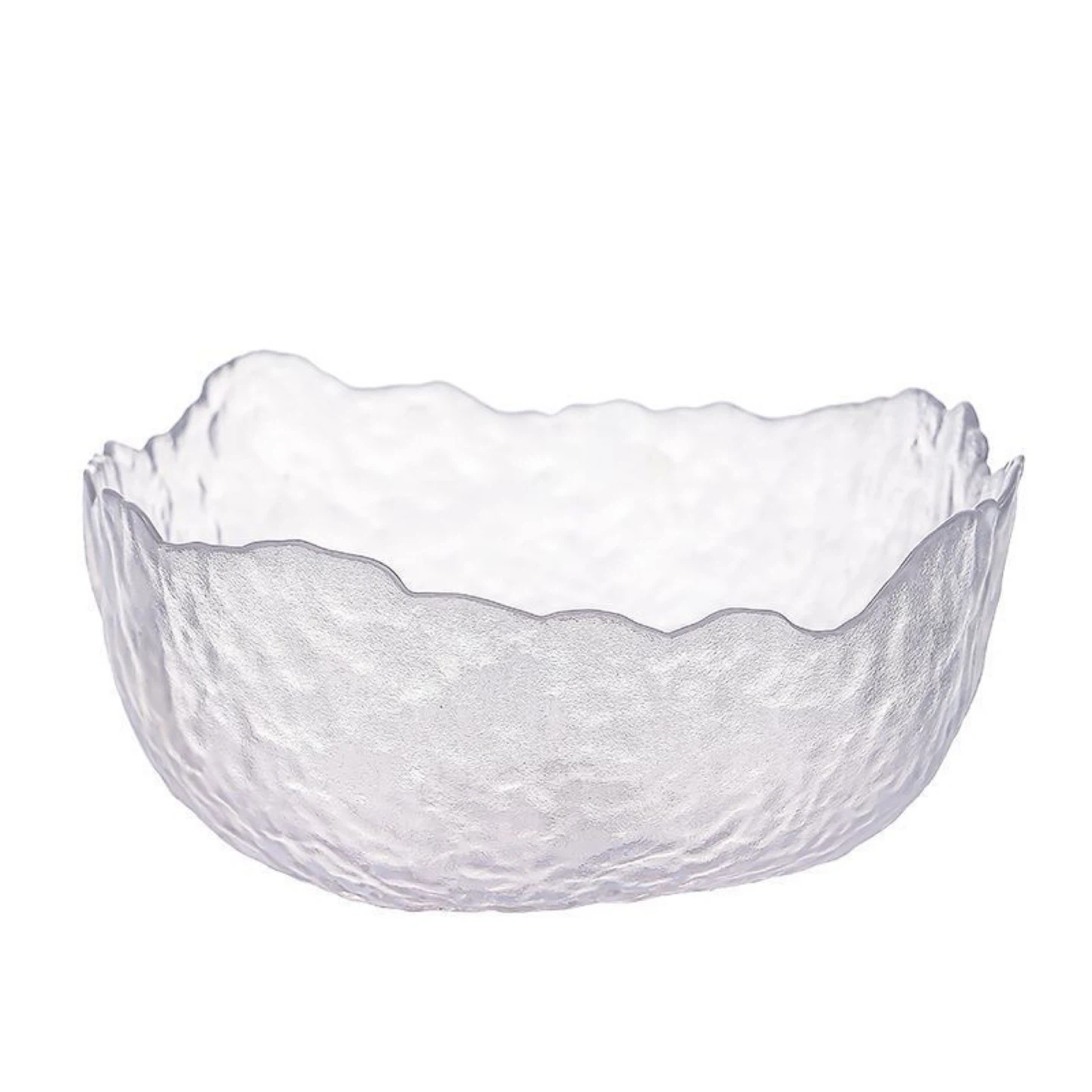 Selling a set of textured glass bowls. These bowls are perfect for salads, fruits, or snacks. They add a touch of elegance to any table setting!