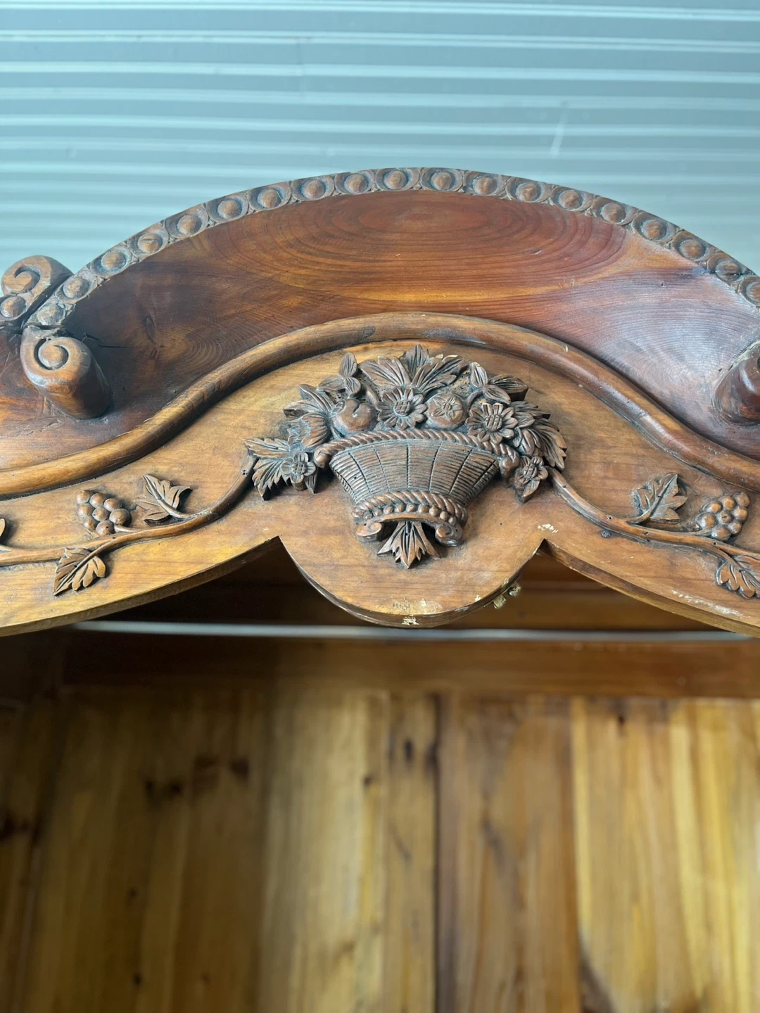 Selling a beautiful antique wooden armoire! It features intricate carvings and a warm, natural wood finish. It has two doors that open to reveal shelving and drawers for storage. Perfect for adding a touch of vintage charm to any room