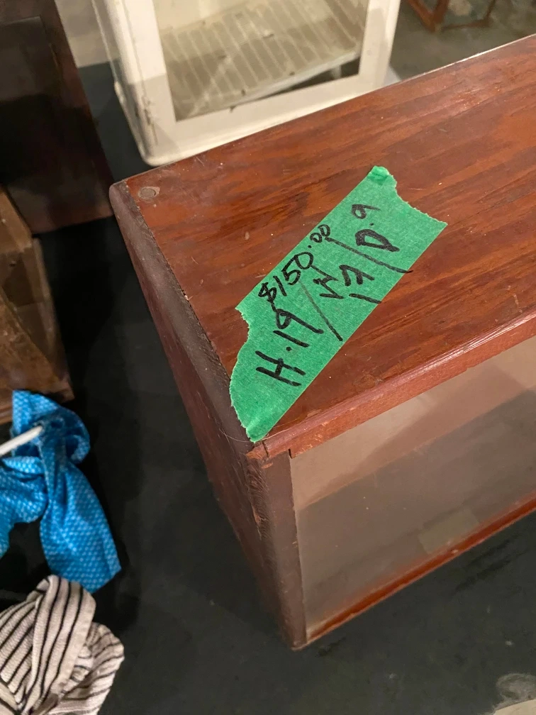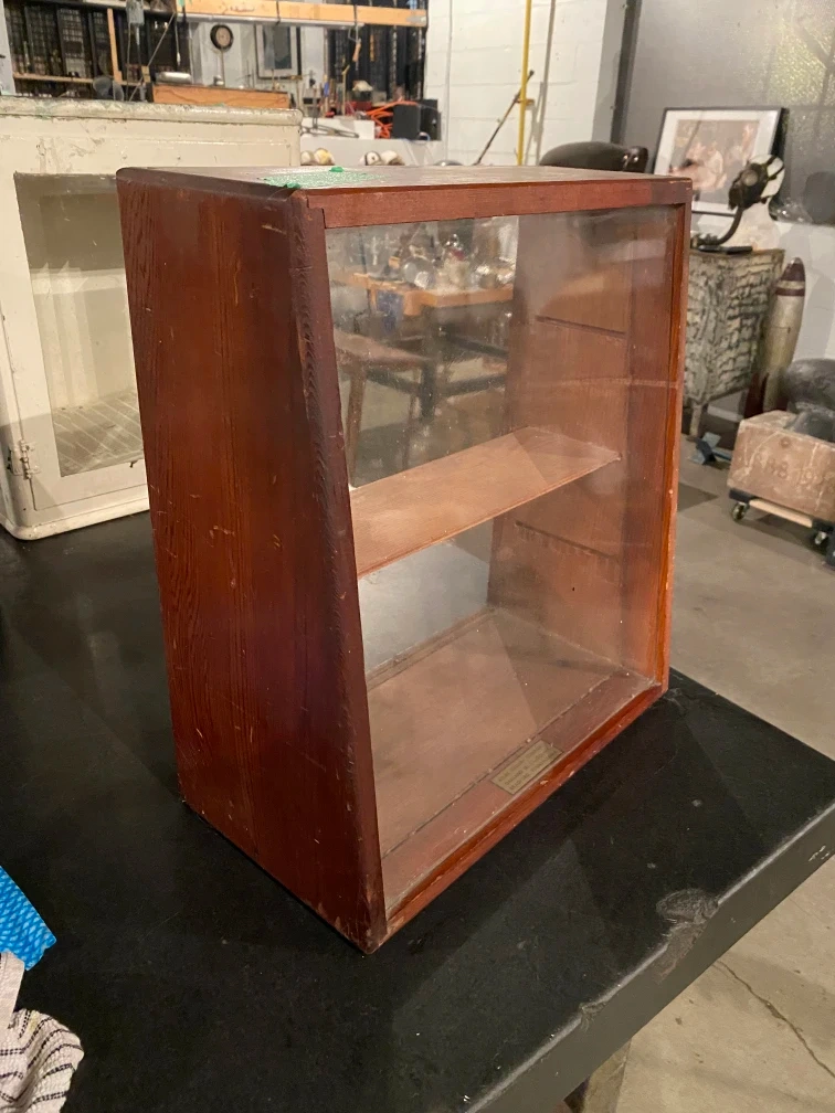 Selling a vintage wooden display cabinet. It has a glass front and a shelf inside.