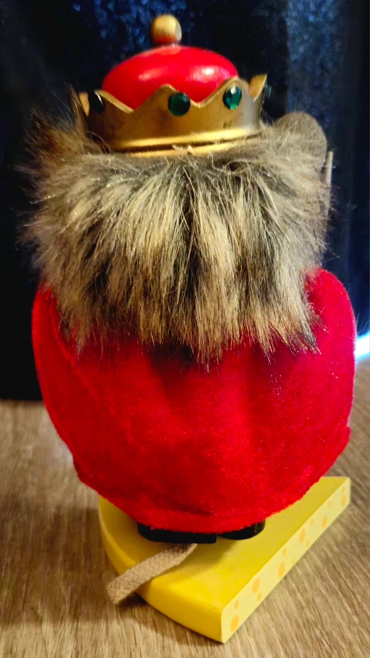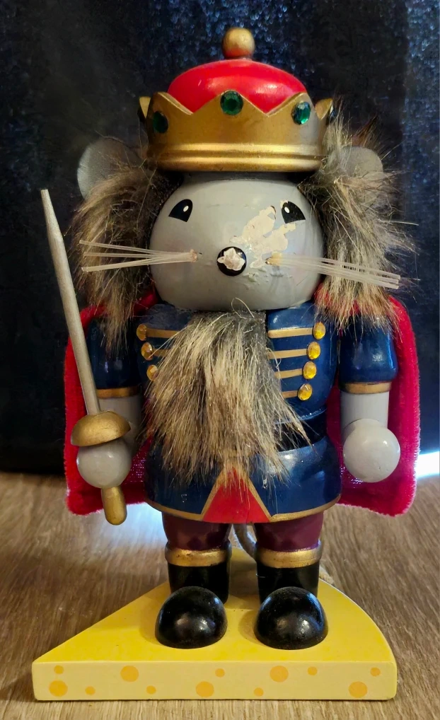 This charming, used, 9-inch tall Mouse King Nutcracker is ready to add a whimsical touch to your holiday decor, standing proudly on its cheese-shaped base. Please note there is a minor paint scuff on his nose, adding character, not detracting from his regal appearance!