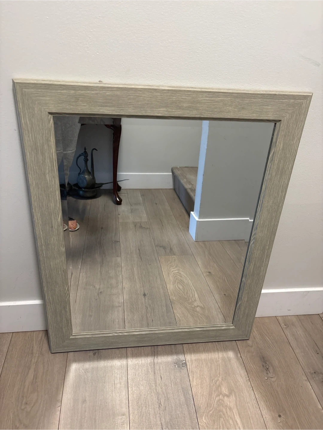 Selling a square wall mirror with a light-coloured wooden frame. It's in great shape and ready to brighten up any room in your home! Perfect for adding a touch of style to your space